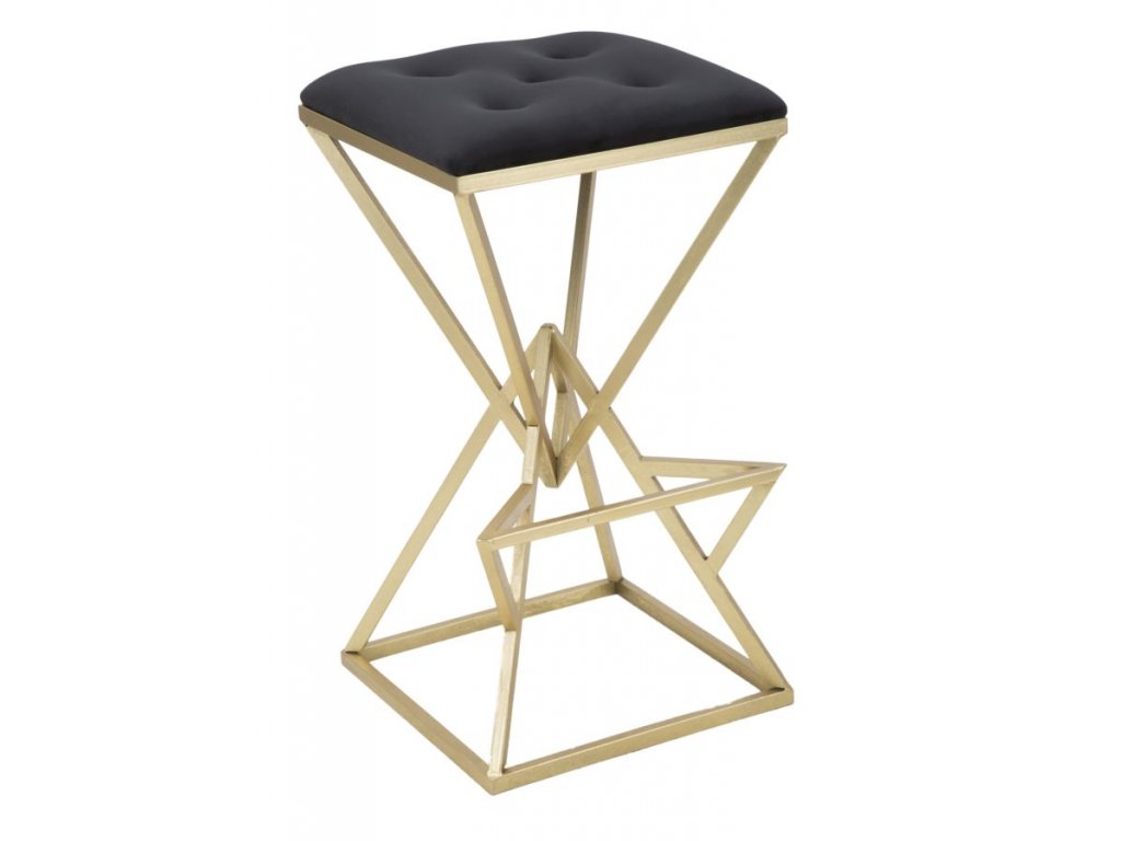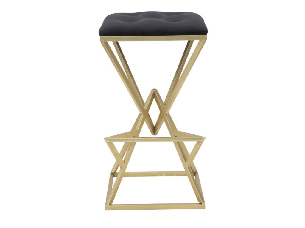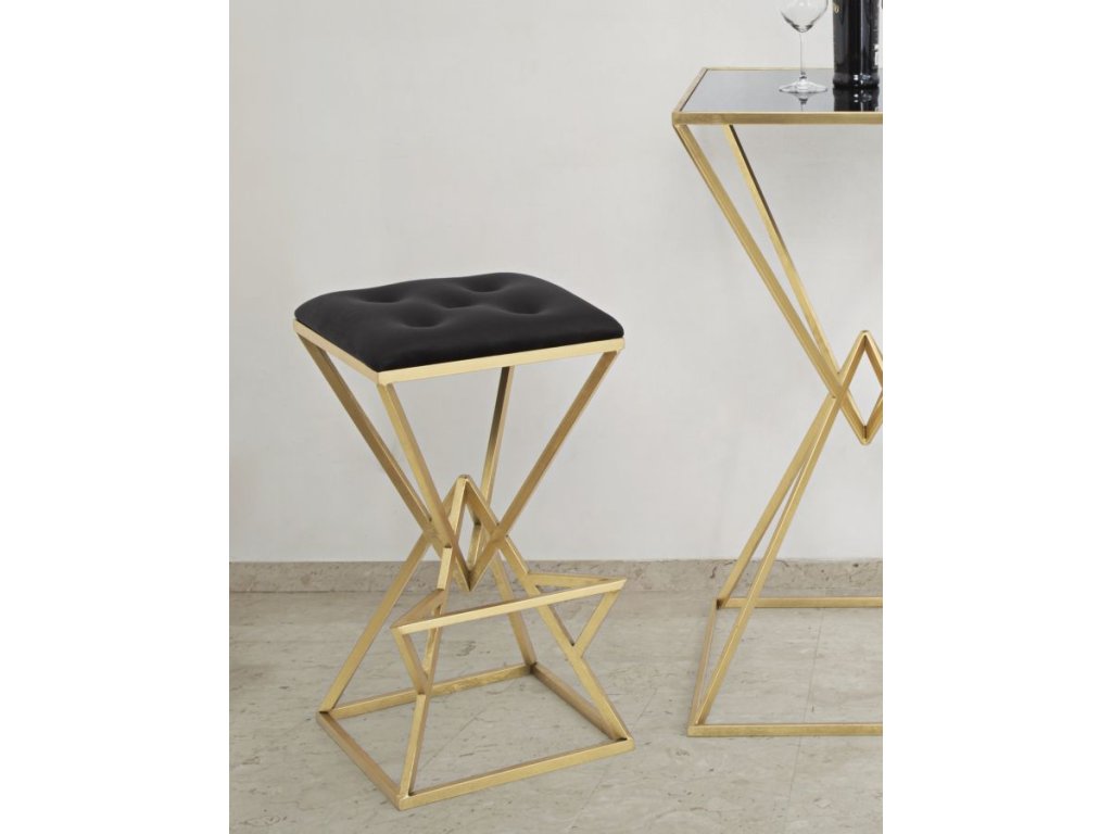 Barová stolička Pyrmo má nádherný zlatý kovový rám tvořený geometrickými motivy pyramidy s elegantní opěrkou na nohy. Sedák je polstrován vysoce kvalitním polyesterem černé barvy. Kombinace černé a zlaté vytváří silný účinek.