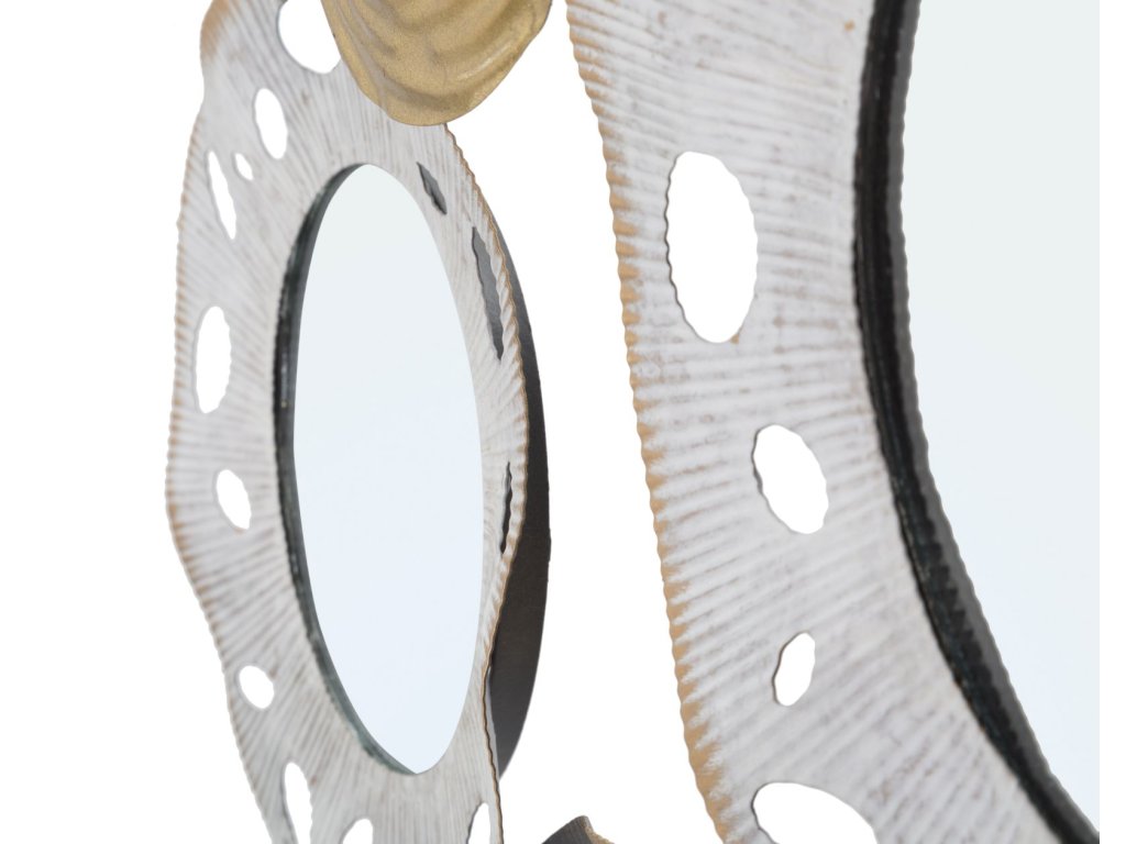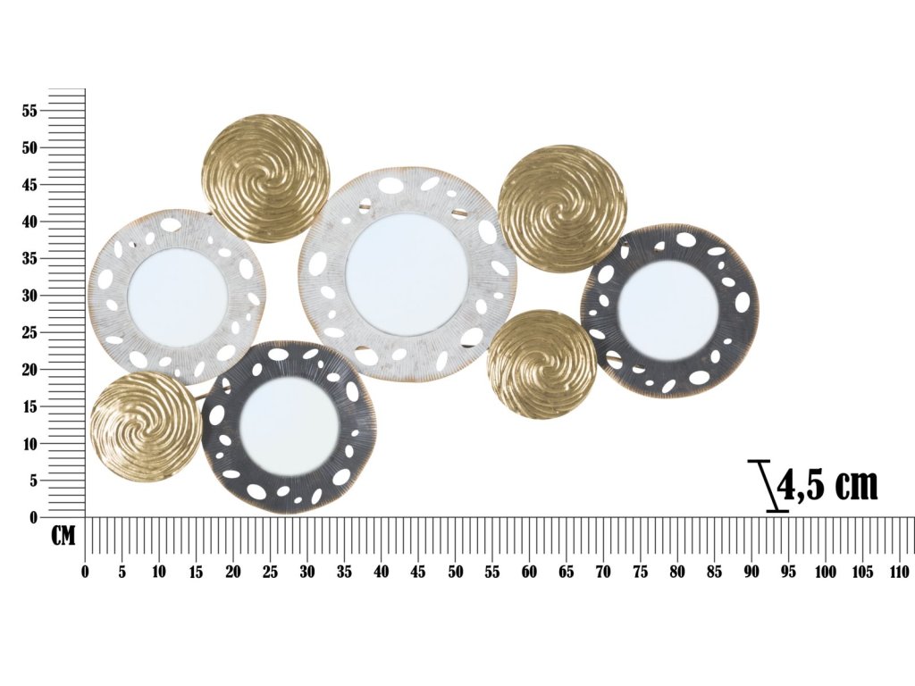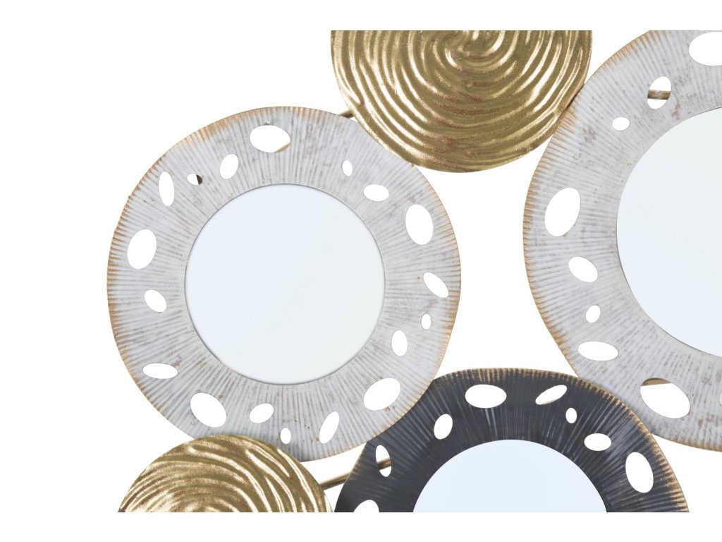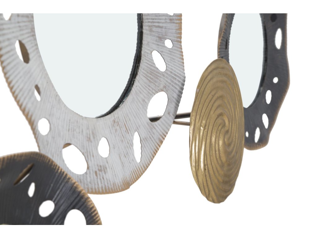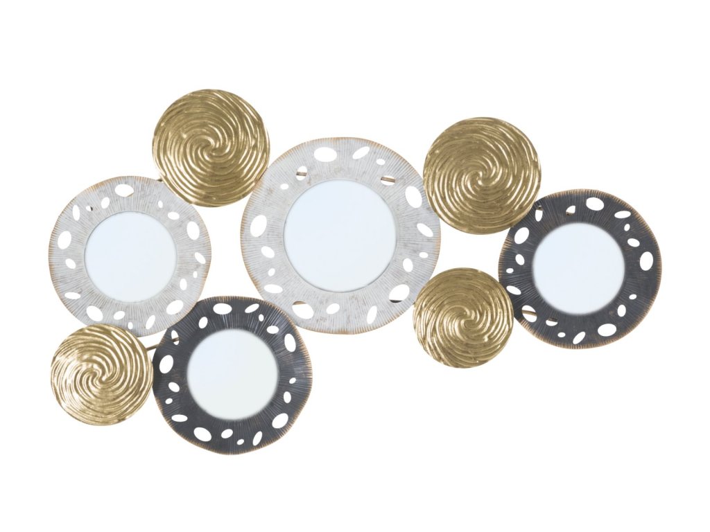 Nástěnná dekorace Glory A je vyrobena z kovu v různých odstínech a mixu barev. Je 3D, tedy plastická. Hlavním motivem jsou abstraktní kulaté tvary a geometrický design. Sekundárním materiálem je MDF a zrcadlové sklo. Přinese vám jemně exotický nádech a přizpůsobí se každé místnosti.