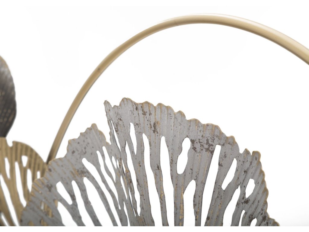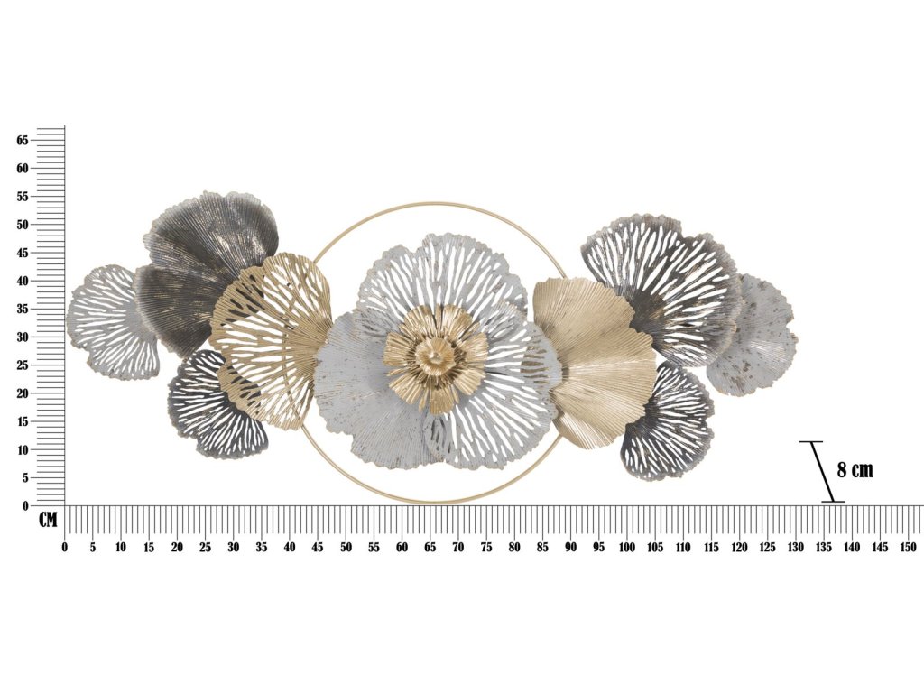 Nástěnná dekorace Poli A je vyrobena z kovu v několika barevných odstínech. Je 3D, tedy plastická. Hlavním motivem jsou střední zlatý kruh, uprostřed něhož je umístěn velký květ a po stranách velké listy, část je perfoforovaná, část plná. Přinese vám do interiéru přírodní nádech a přizpůsobí se každé místnosti.