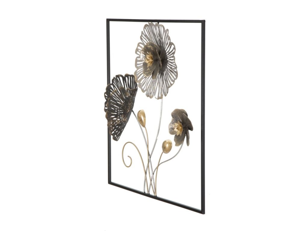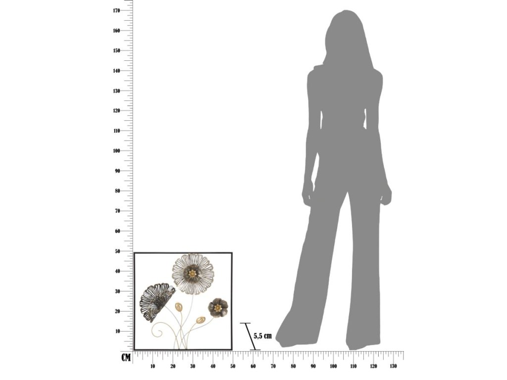 Nástěnná dekorace Vilti je vyrobena z kovu v různých barevných odstínech. Je 3D, tedy plastická. Hlavním motivem jsou abstraktní květy na stoncích v tmavších barvách, kdy část je preforovaná a část plná. Přinese vám jemně exotický nádech a přizpůsobí se každé místnosti.