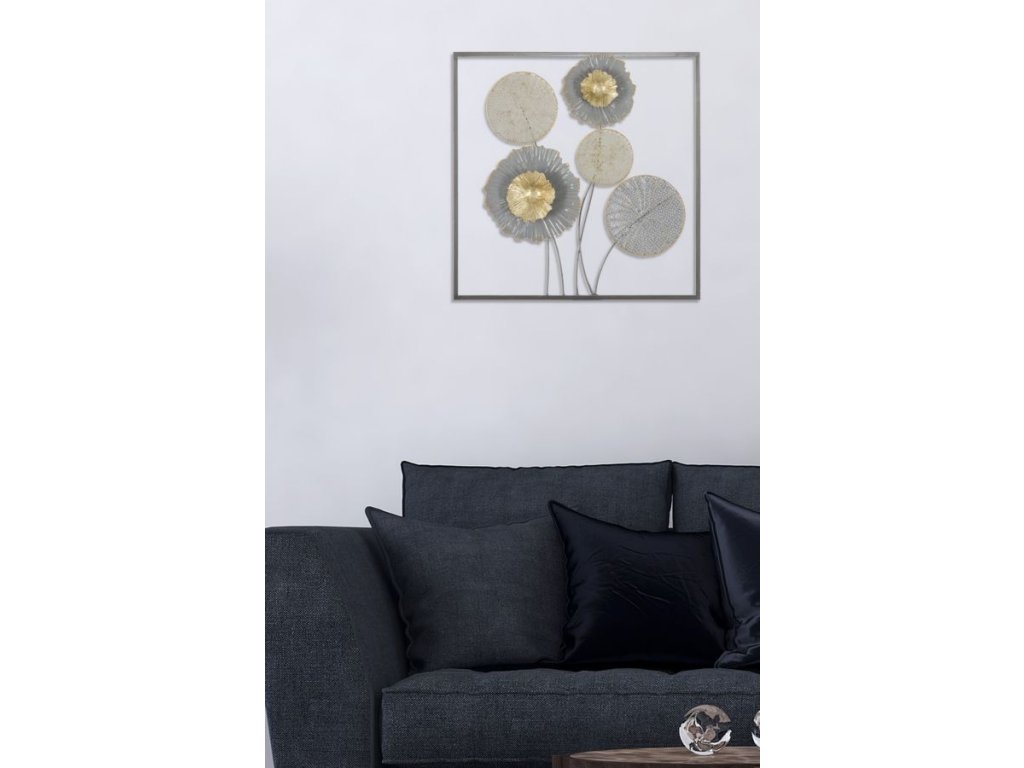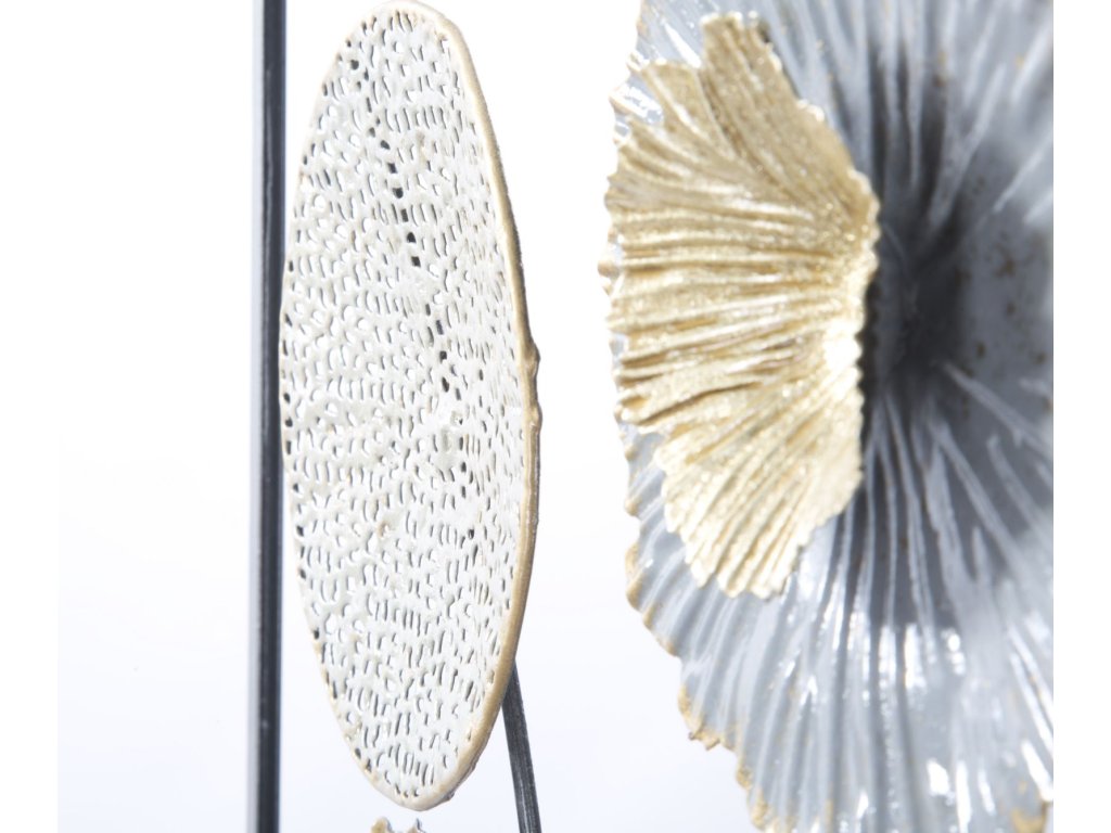 Nástěnná dekorace Vilti Grey je vyrobena z kovu v různých barevných odstínech. Je 3D, tedy plastická. Hlavním motivem jsou abstraktní květy na stoncích v jemných barvách, kdy část je preforovaná a část plná. Přinese vám jemně exotický nádech a přizpůsobí se každé místnosti.