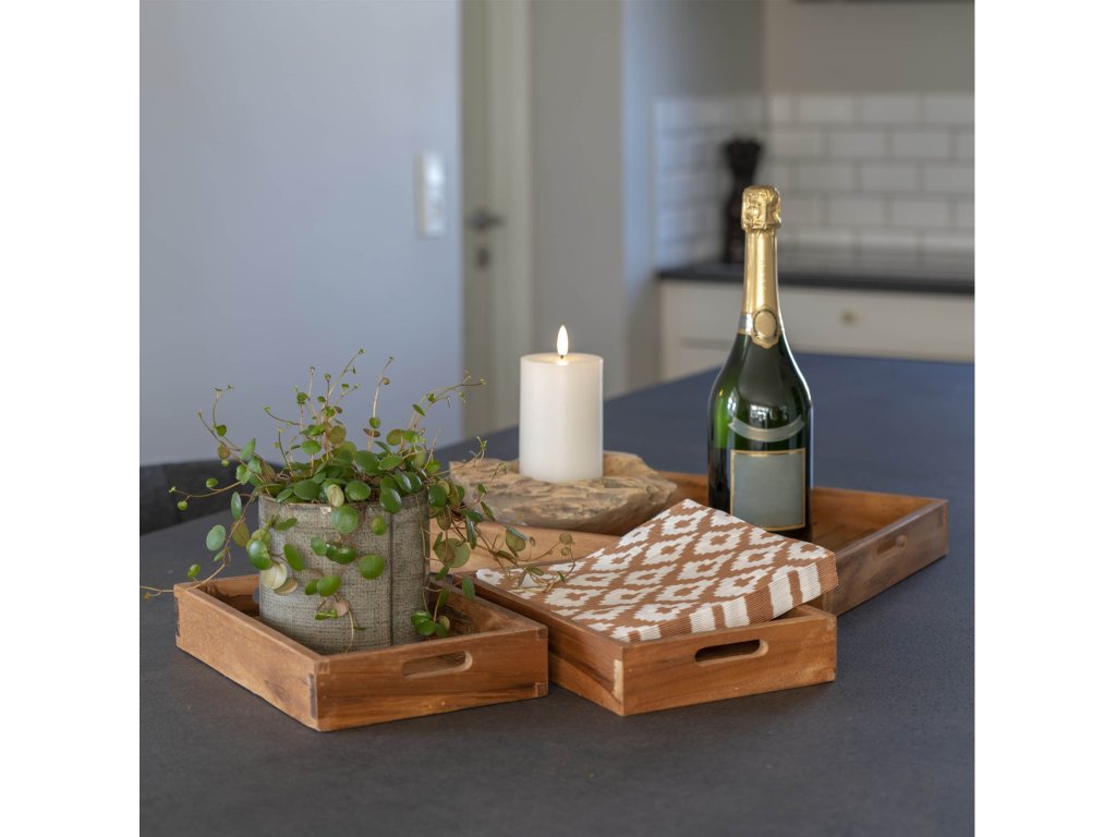 Servírovací či dekorační sada 3 kusů táců Marko je elegantním designovým doplňkem a pomocníkem do každého interiéru. Je vyrobena z kvalitního, teakového dřeva hnědé barvy a obsahuje jeden velký a dva menší tácy.