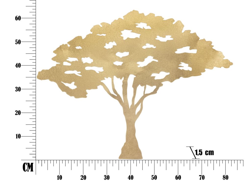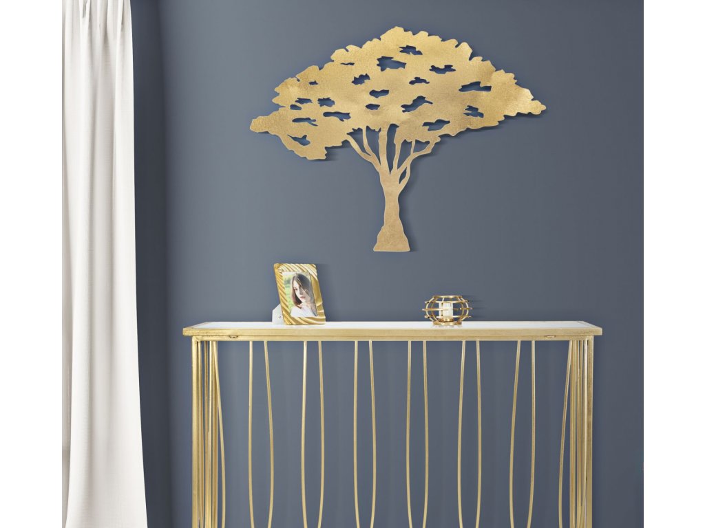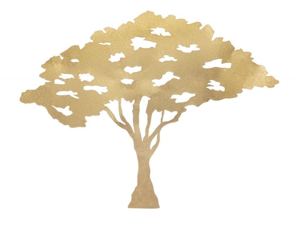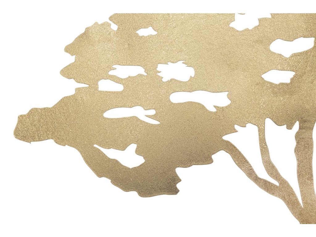 Kovová nástěnná dekorace zlaté barvy Alisen nádherně doplní váš interiér. Je vyrobena z kovu ve tvaru stromu s hustou korunou, vše spojeno do jednoho reliéfu. Dekorace je v tzv. GLAM stylu.