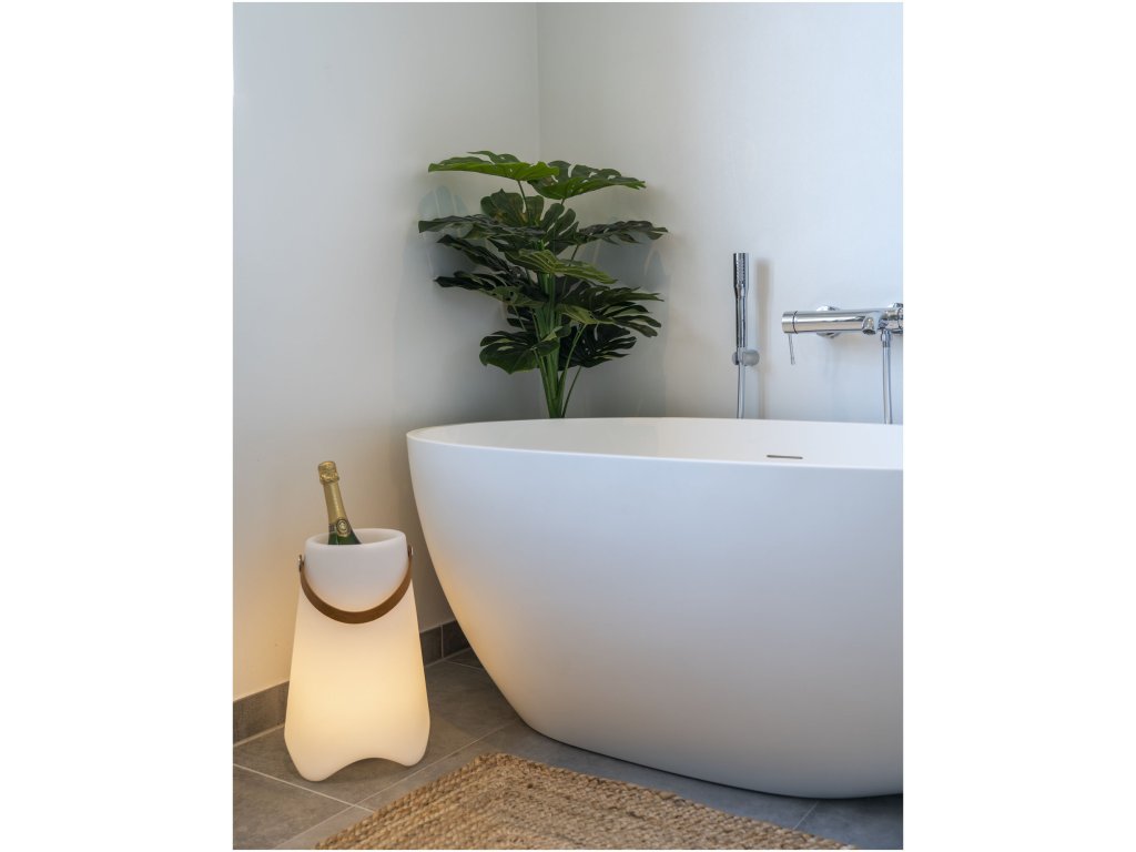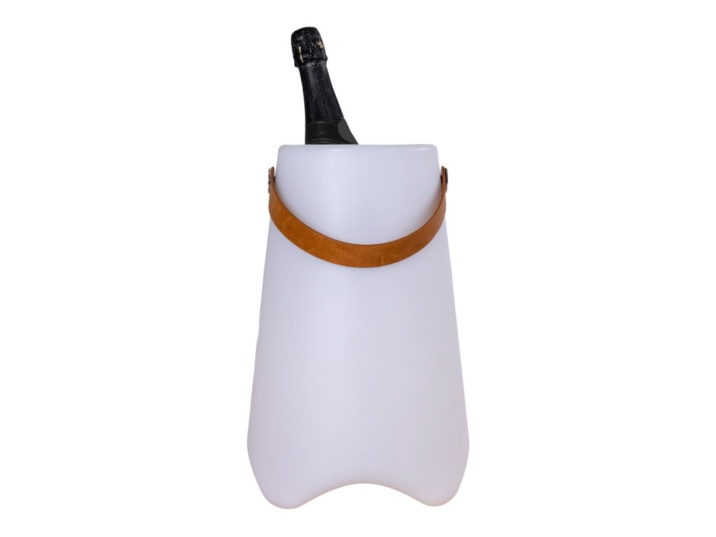 Chladič plastový bílý LED Vinkaler s flexibilní chladící s popruhem. Chladicí nádoba vychladí láhev s vínem nebo šampaňským a udrží nápoj vychlazený během podávání.