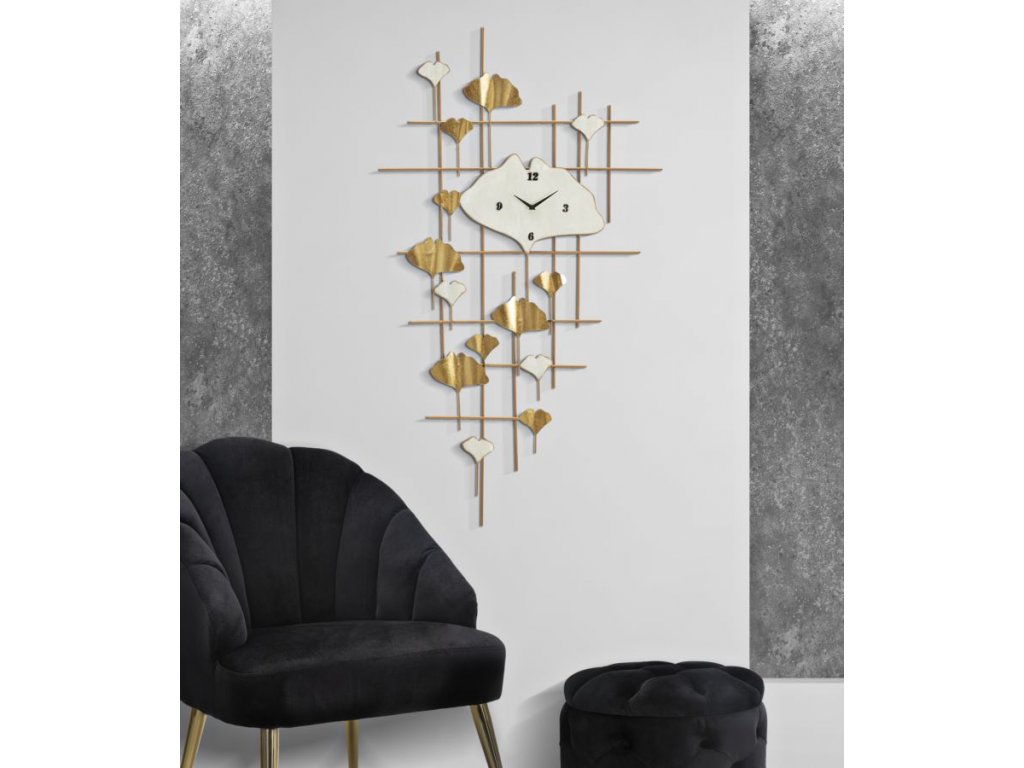 Nástěnné hodiny Villian s ciferníkem inspirovaným listem zasazeným do 3D dekorativního panelu s geometrickou strukturou zdobenou ozdobami ve tvaru listu. Jasná barva v kombinaci s bílou vytváří fascinující kontrast.
