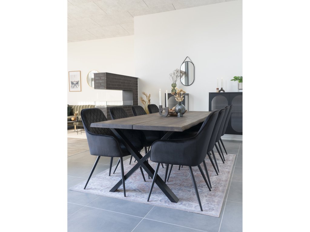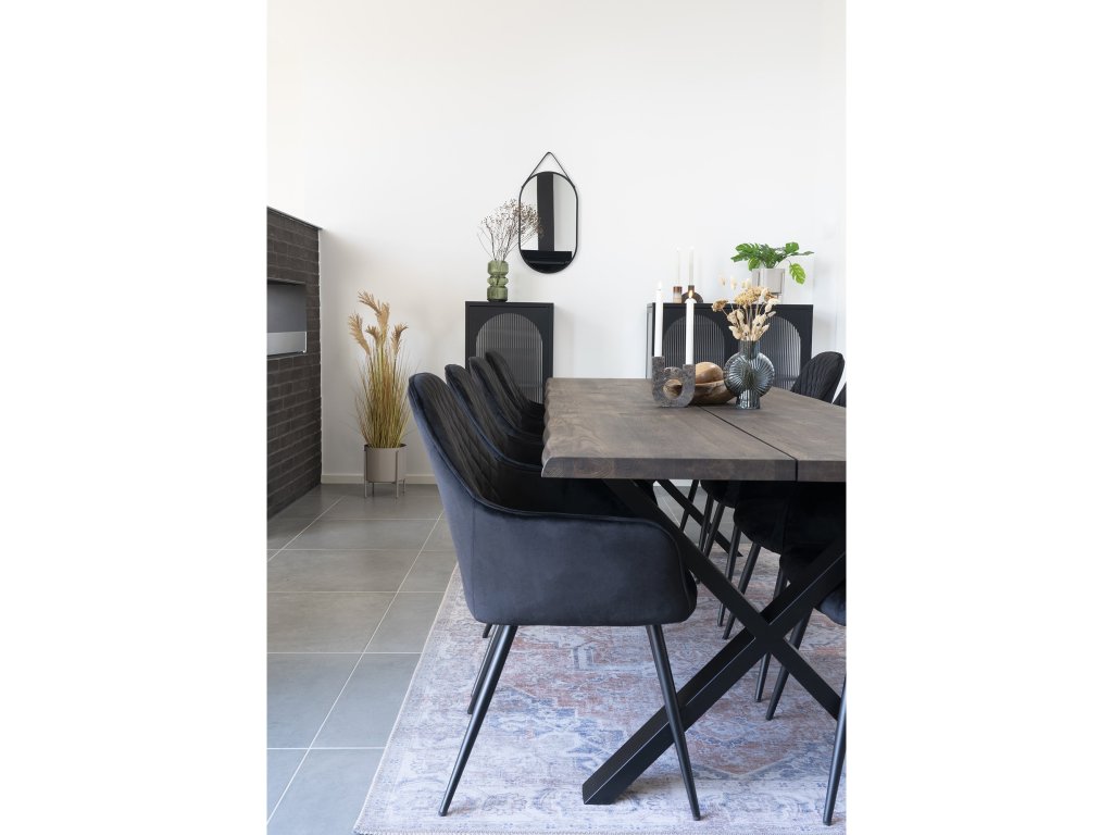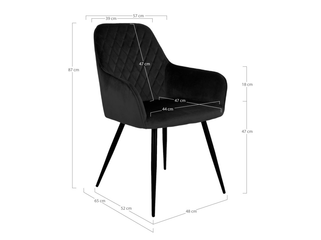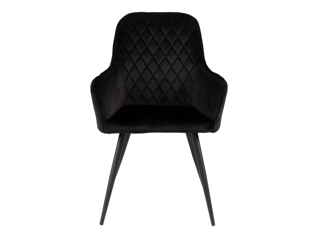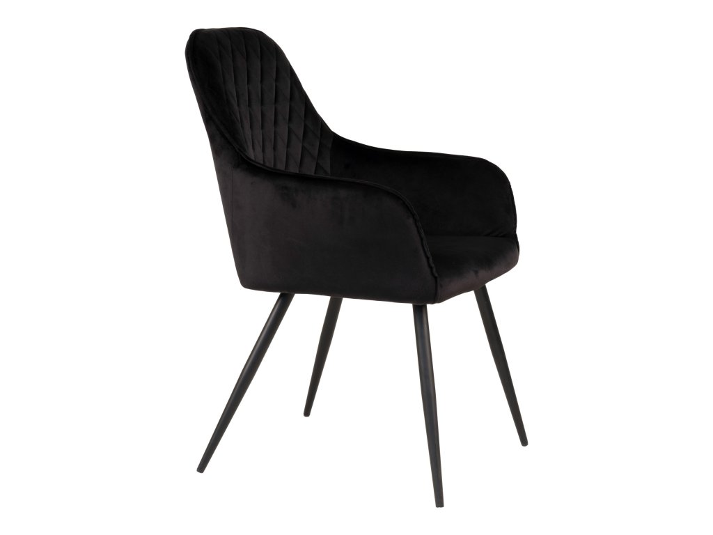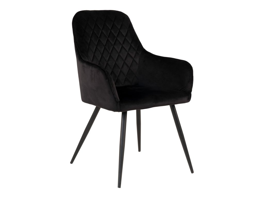 Jídelní židle Harko patří mezi luxusní prvky interiéru. Je čalouněna vysoce kvalitním černým sametem, přičemž zádová opěrka má velice krásné prošívání. Nohy jsou kovové, černé barvy. Židle má loketní opěrky, díky čemuž je pohodlná i pro delší sezení.