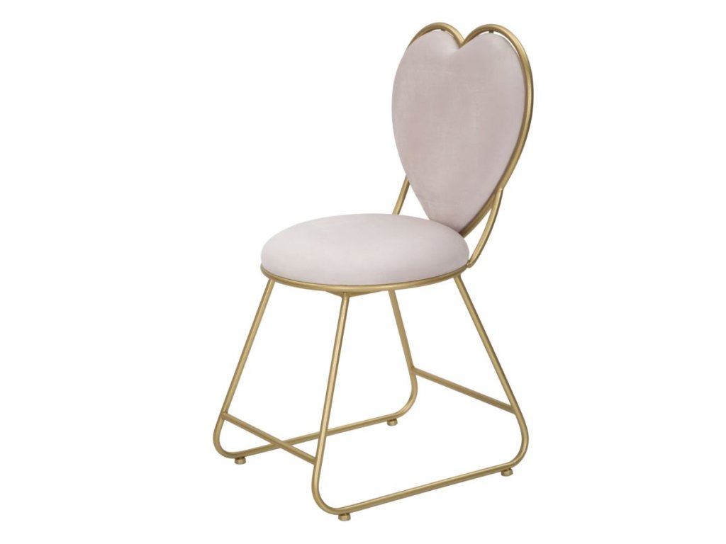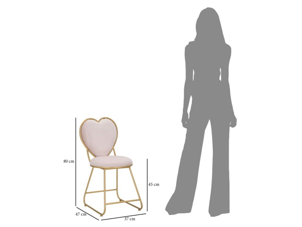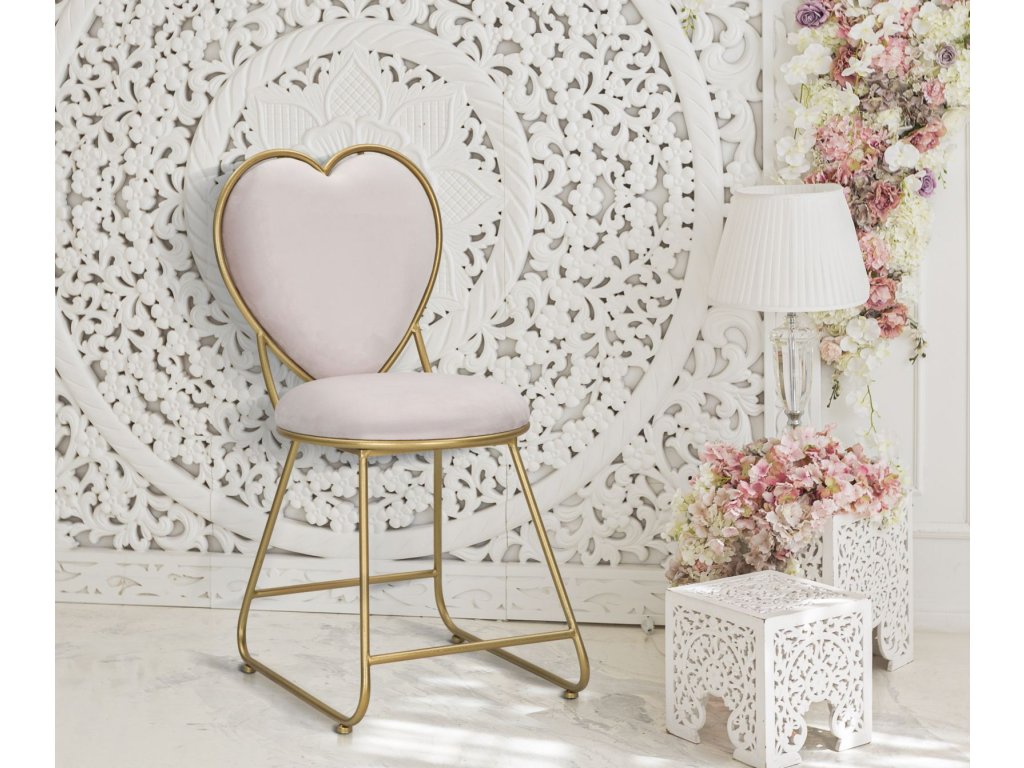 Zlatá kovová židle Love je vyrobena z kovu zlaté barvy s bohatě polstrovaným sedákem a opěradlem z vatované látky velmi světle růžové barvy. Zadní strana ve tvaru srdce ozvláštňuje předmět a dodává mu nádech něhy. Skvěle se bude hodit kupříkladu je konzolovému stolku.
