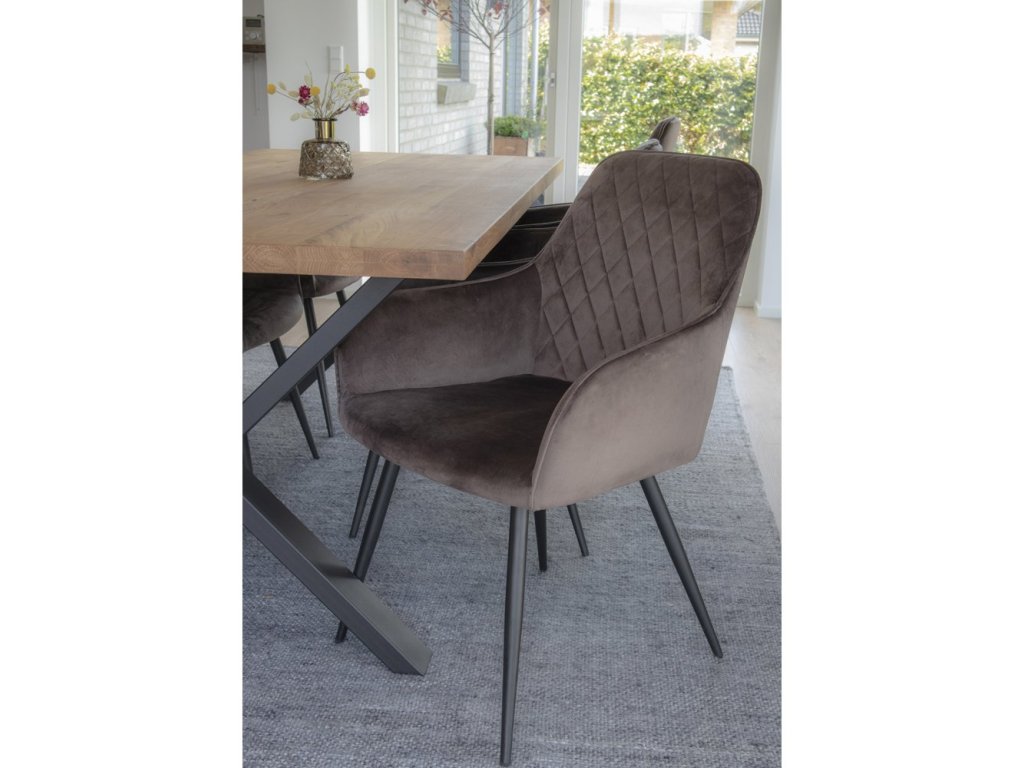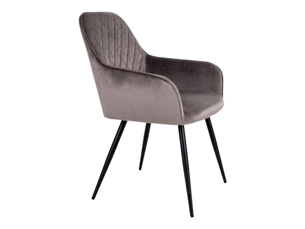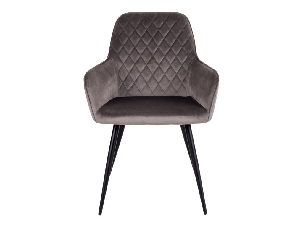 Jídelní židle Harko patří mezi luxusní prvky interiéru. Je čalouněna vysoce kvalitním šedým sametem, přičemž zádová opěrka má velice krásné prošívání. Nohy jsou kovové, černé barvy. Židle má loketní opěrky, díky čemuž je pohodlná i pro delší sezení.