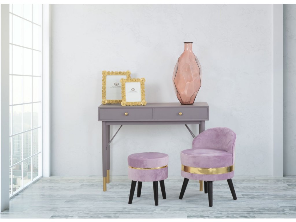 Luxusní mini stolička Faria je vyrobena ze dřeva, nohy jsou černé, čalouněna je vysoce kvalitním umělým sametem a má zlatý pásek, který ji dodává na jedinečnosti. Stolička přímo vybízí k usazení díky pohodlnému polstrování sedáku a vaše děti si jej zamilují.