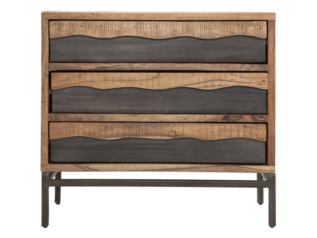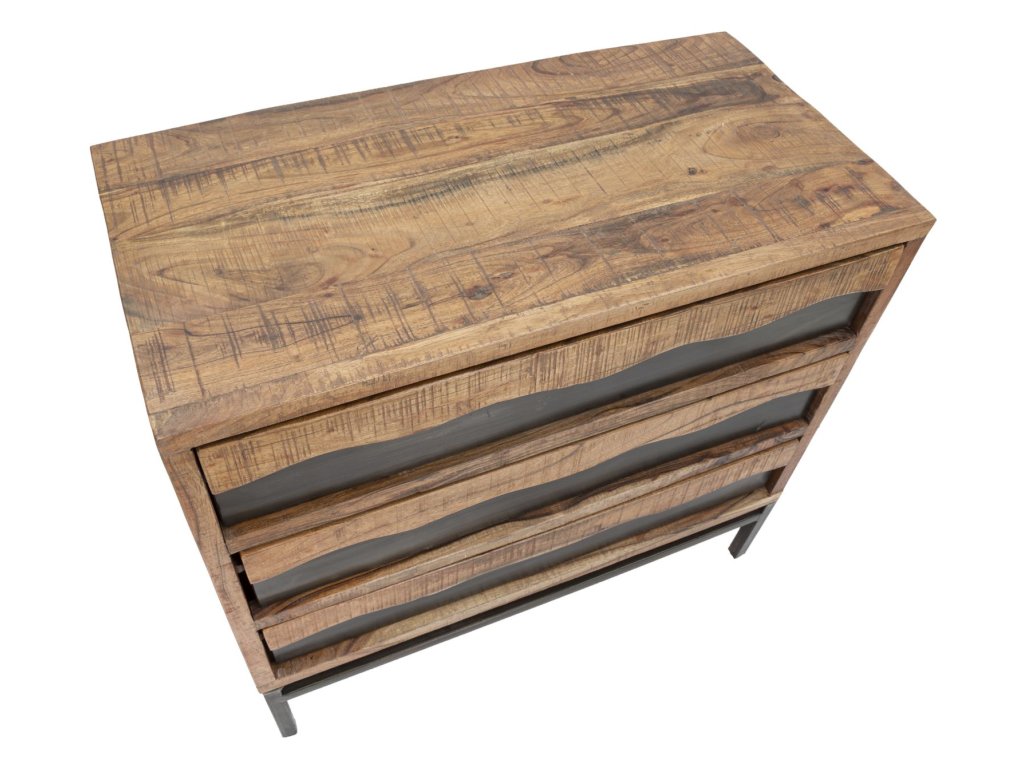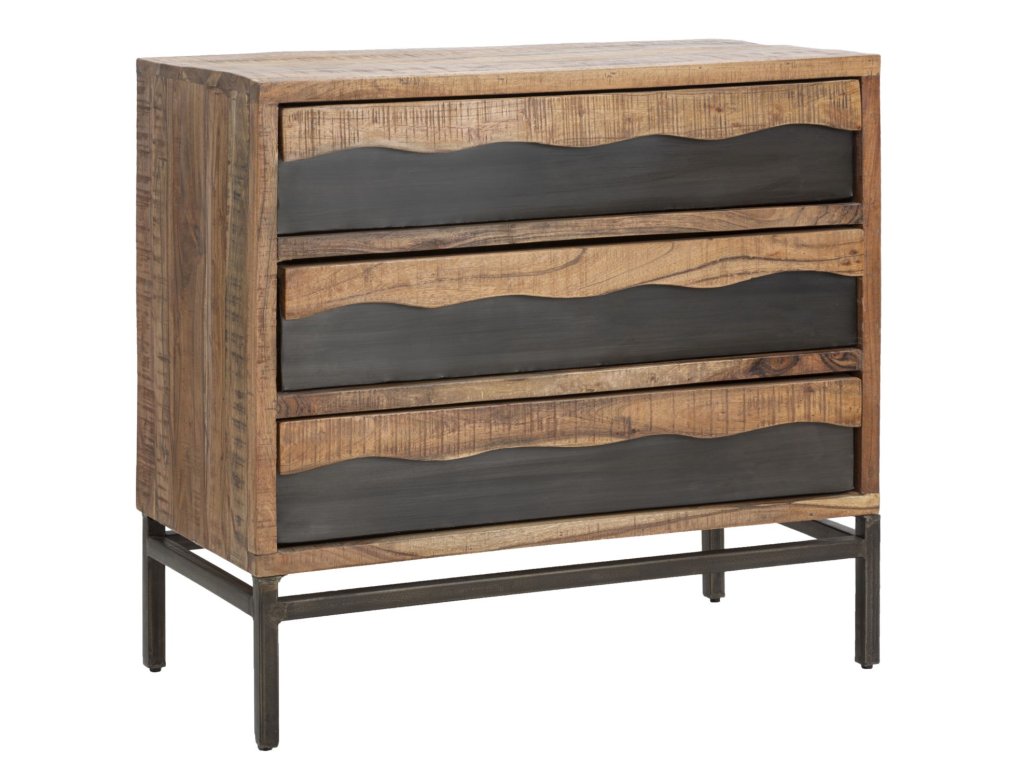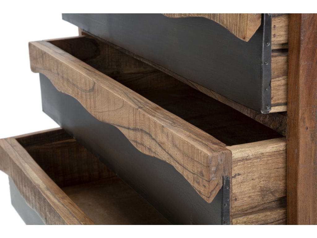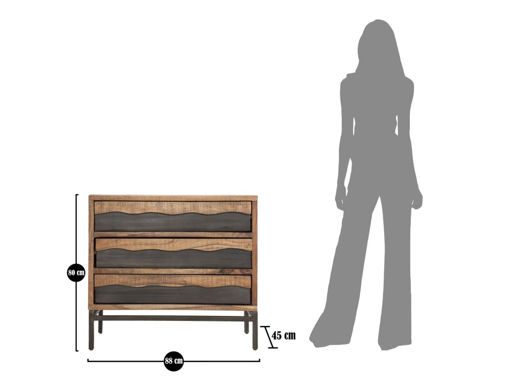 Komoda či šatník Ytaro III je vyrobena z masivního akáciového dřeva, překližky a kovového rámu. Na pravé straně má dvě zásuvky, v levé části zase dvě dvířka vedoucí do úložného prostoru. Zvláštní zvlněný design spolu s černými kovovými nohami vytváří originální a elegantní design pro klasický kousek.