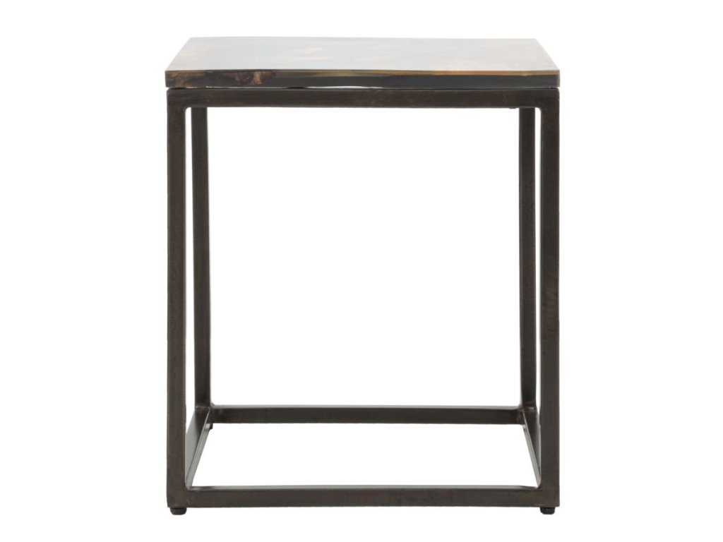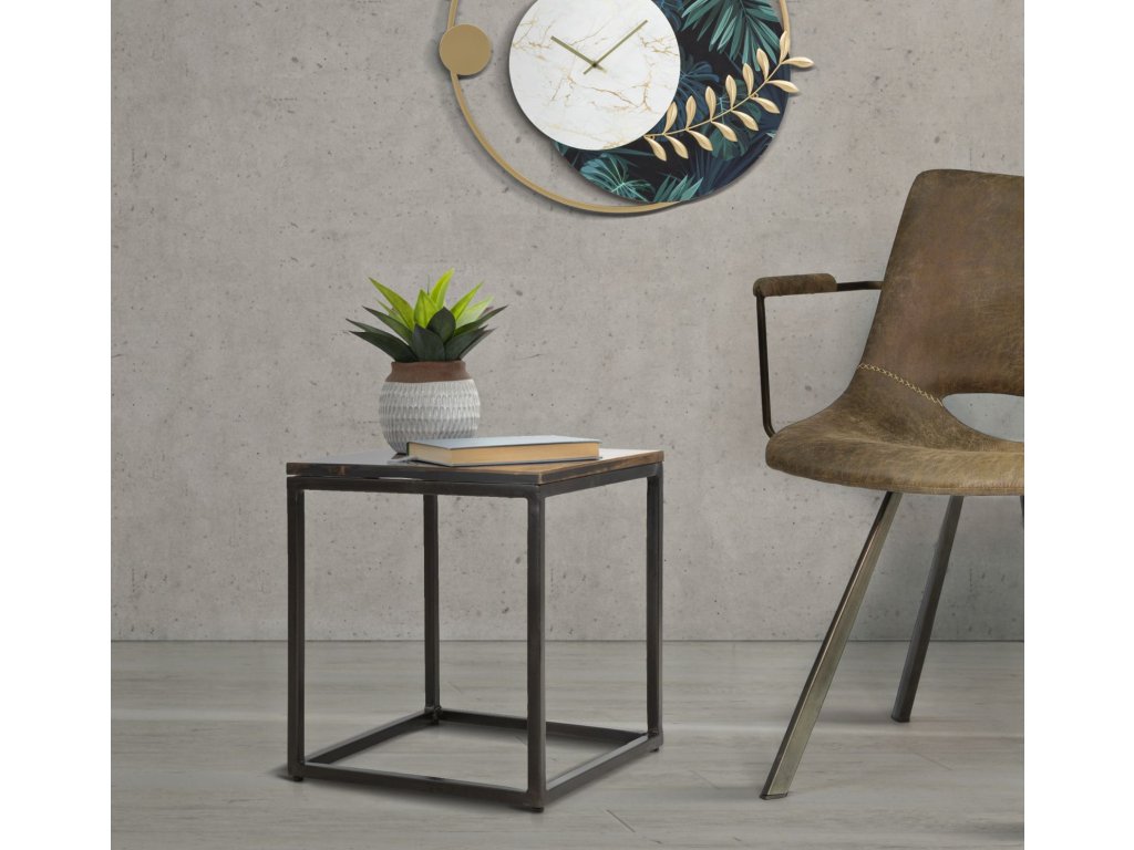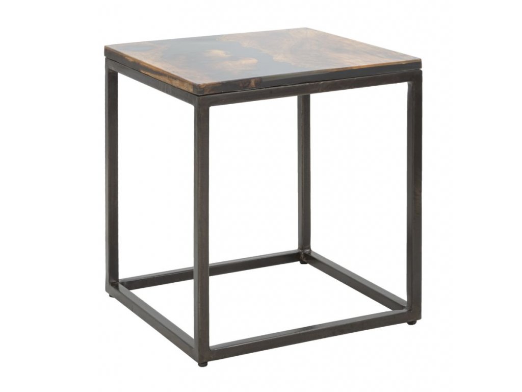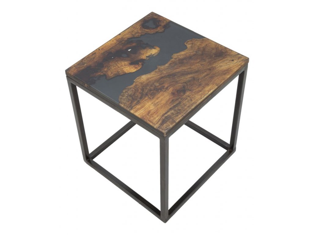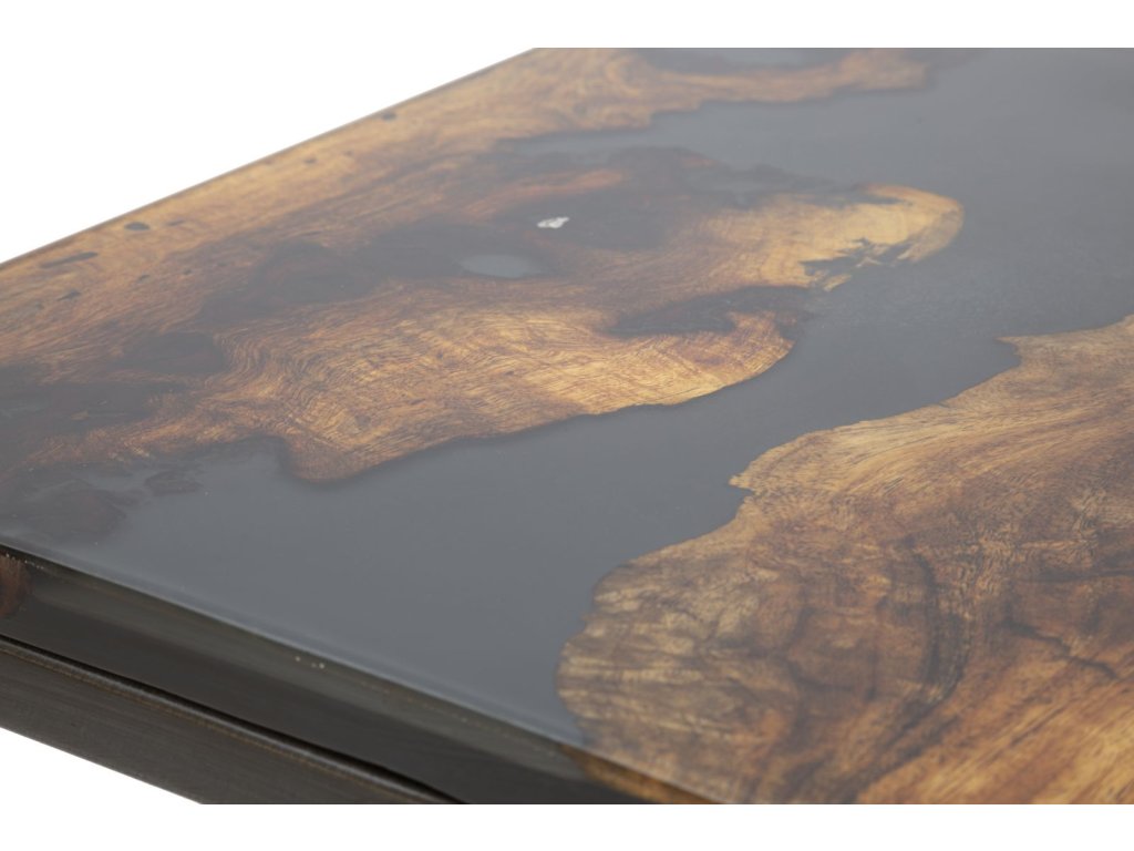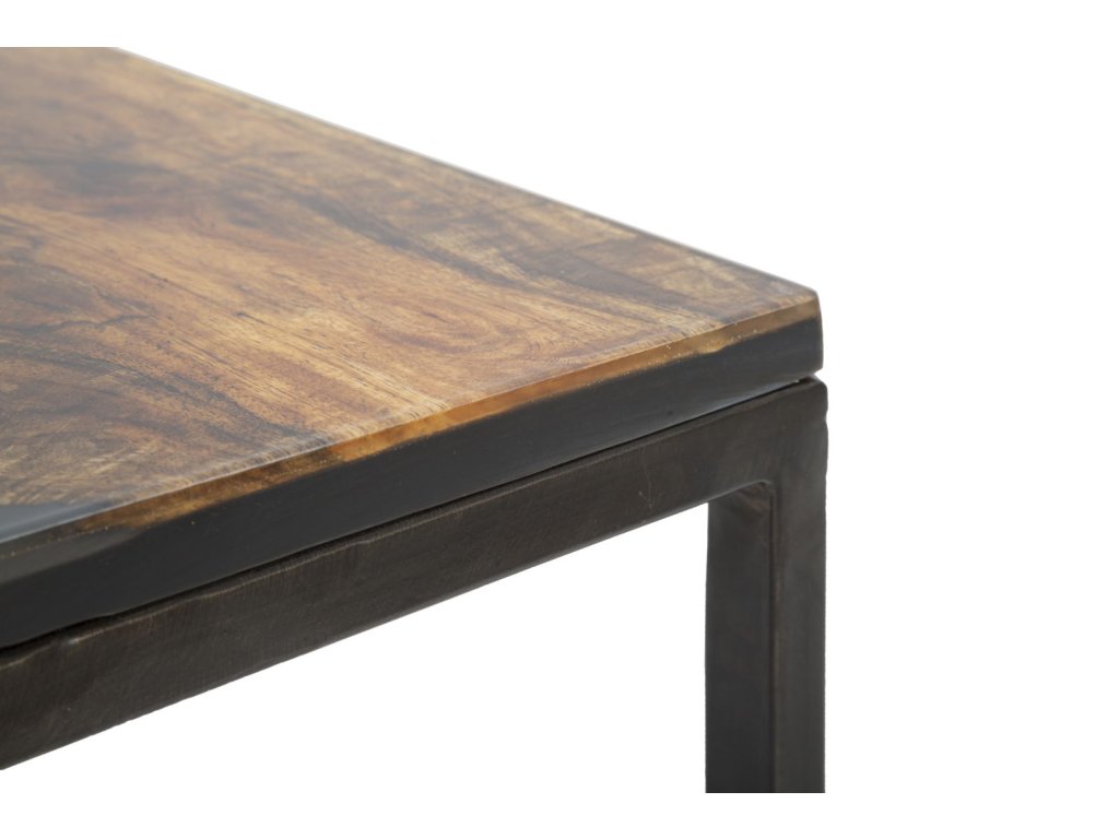 Elegantní čtvercový konferenční stolek Taran s deskou z masivního akáciového dřeva a černýma kovovýma nohama. Zvláštní zpracování s pryskyřicí nasazenou na vrchní straně mu dodává nádech jedinečnosti a modernosti k jinak elegantnímu a klasickému stylu