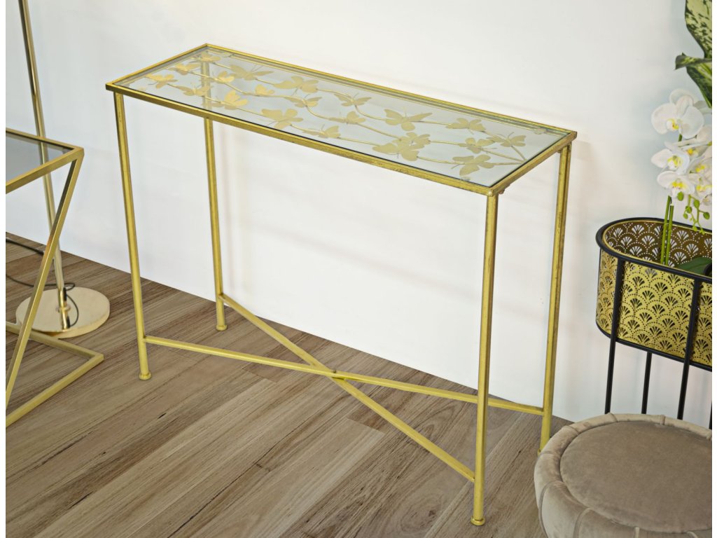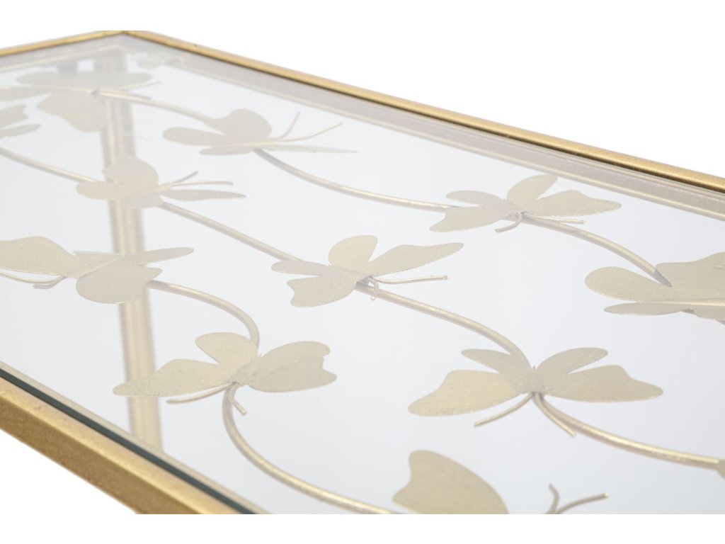 Konzolový stolek Butterflies je vyroben ze zlatého kovu se skleněnou deskou. Pod vrškem jsou velmi elegantní ozdoby ve tvaru motýlků. Zvláštní dekorace v kombinaci se základním designem dodávají každé místnosti nádech třídy, aniž by celek příliš zatěžovaly.