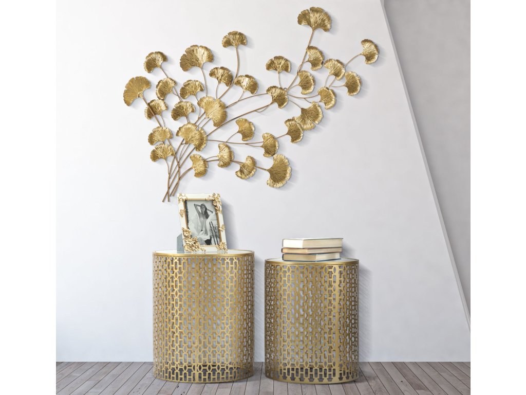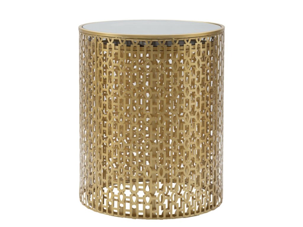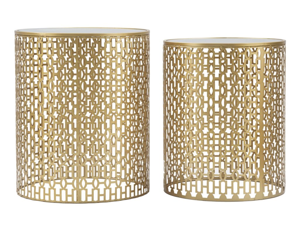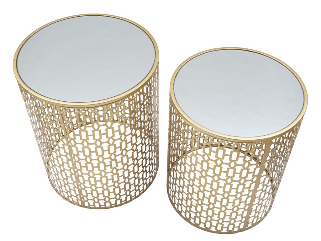 Sada 2 kulatých stolků ze zlatého kovu se zrcadlovou deskou. Jednotlivé řezbářské práce připomínají vzácnou výzdobu barokních kostelů, aniž by snižovaly design. Dotek třídy a zvláštnosti, aby byl váš obývací pokoj výjimečný.