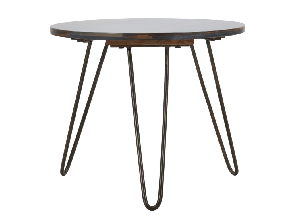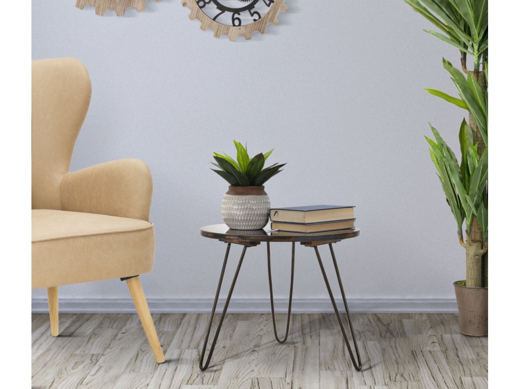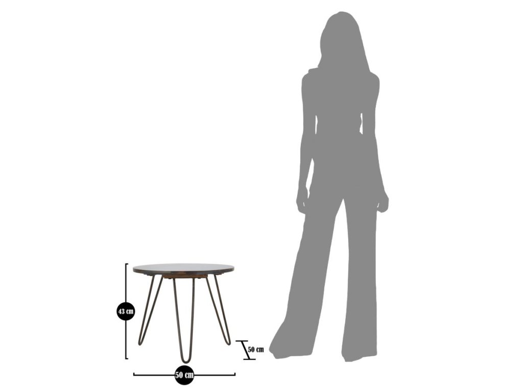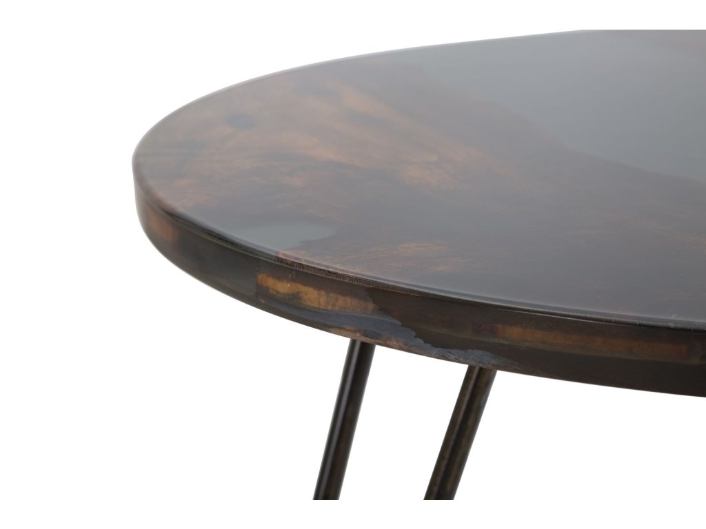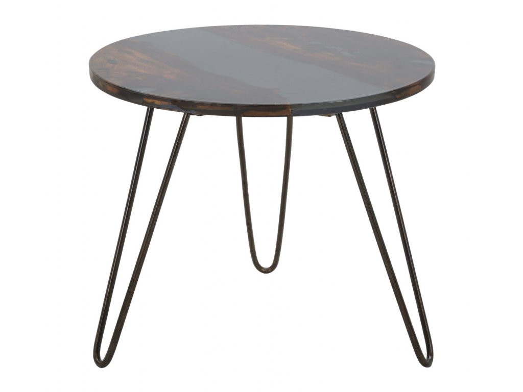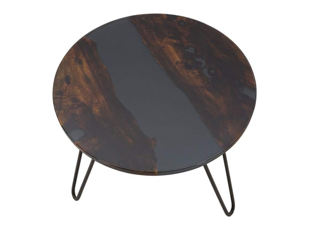 Elegantní kulatý konferenční stolek Taran s deskou z masivního akáciového dřeva a černýma kovovýma nohama. Zvláštní zpracování s pryskyřicí nasazenou na vrchní straně mu dodává nádech jedinečnosti a modernosti k jinak elegantnímu a klasickému stylu