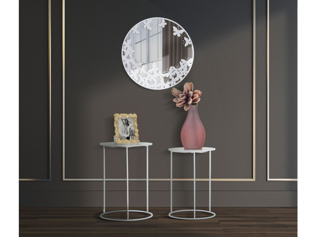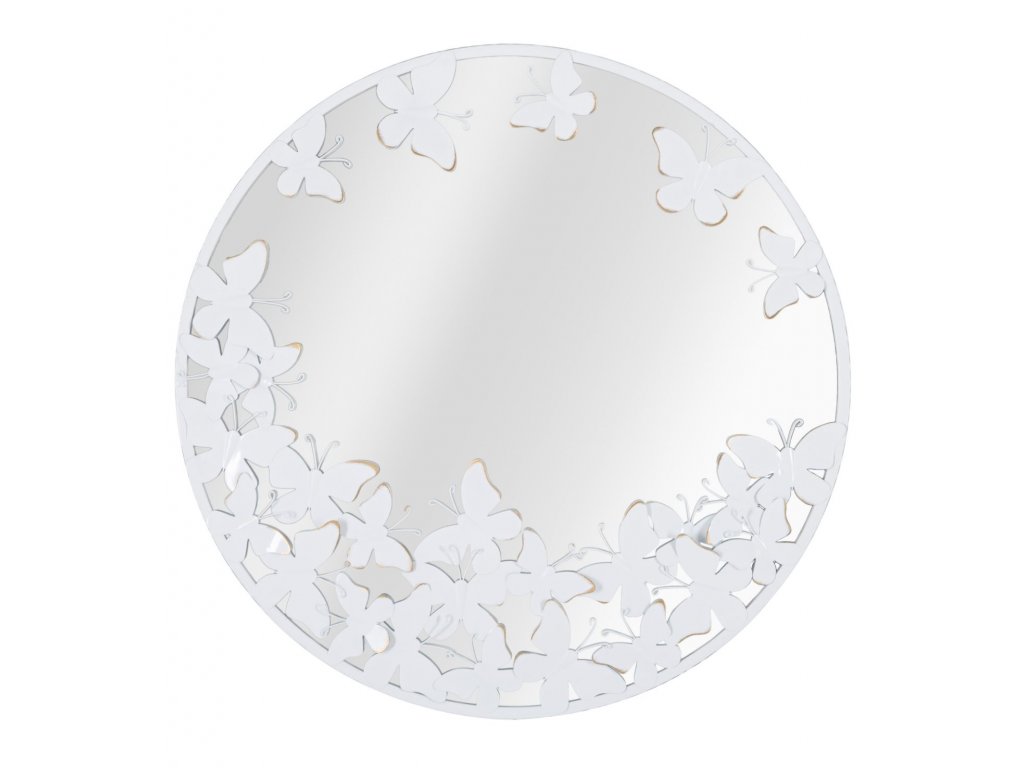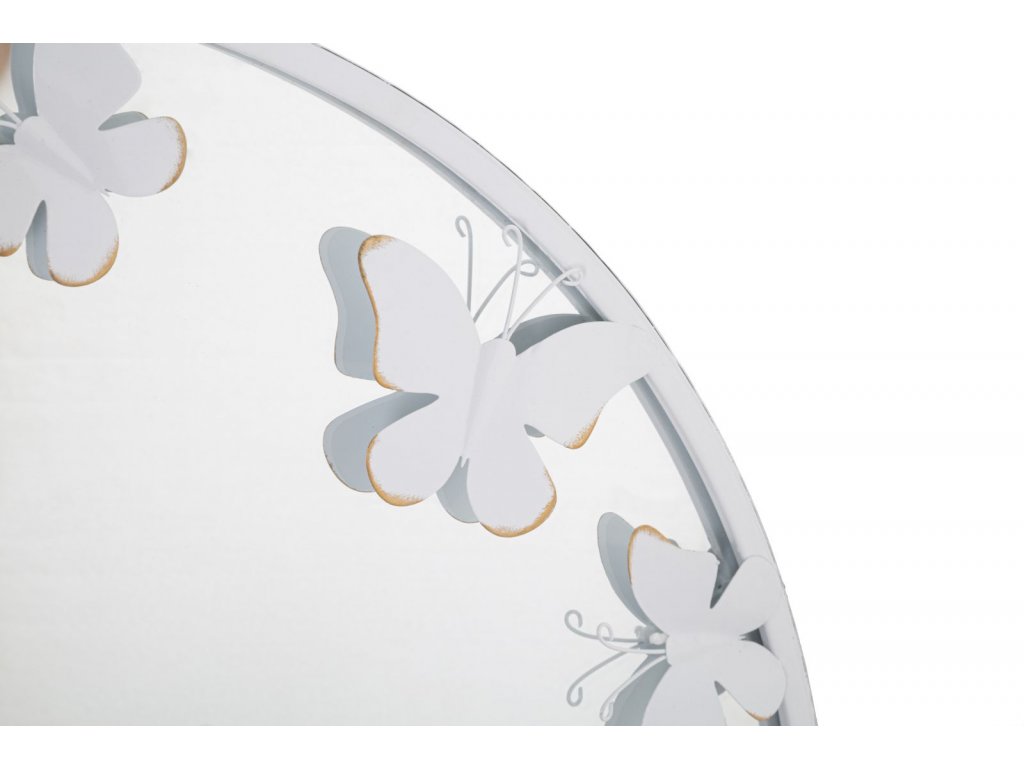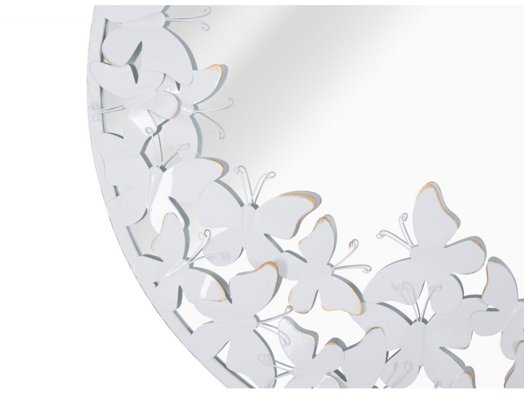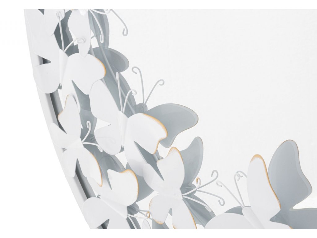 Kulaté zrcadlo z bílého kovu s elegantními dekorativními motýly. Zrcadla jsou základním prvkem, který dodává na půvabné atmosféře. Opticky rozšiřují prostory a vytvářejí příjemný pocit v interiéru.