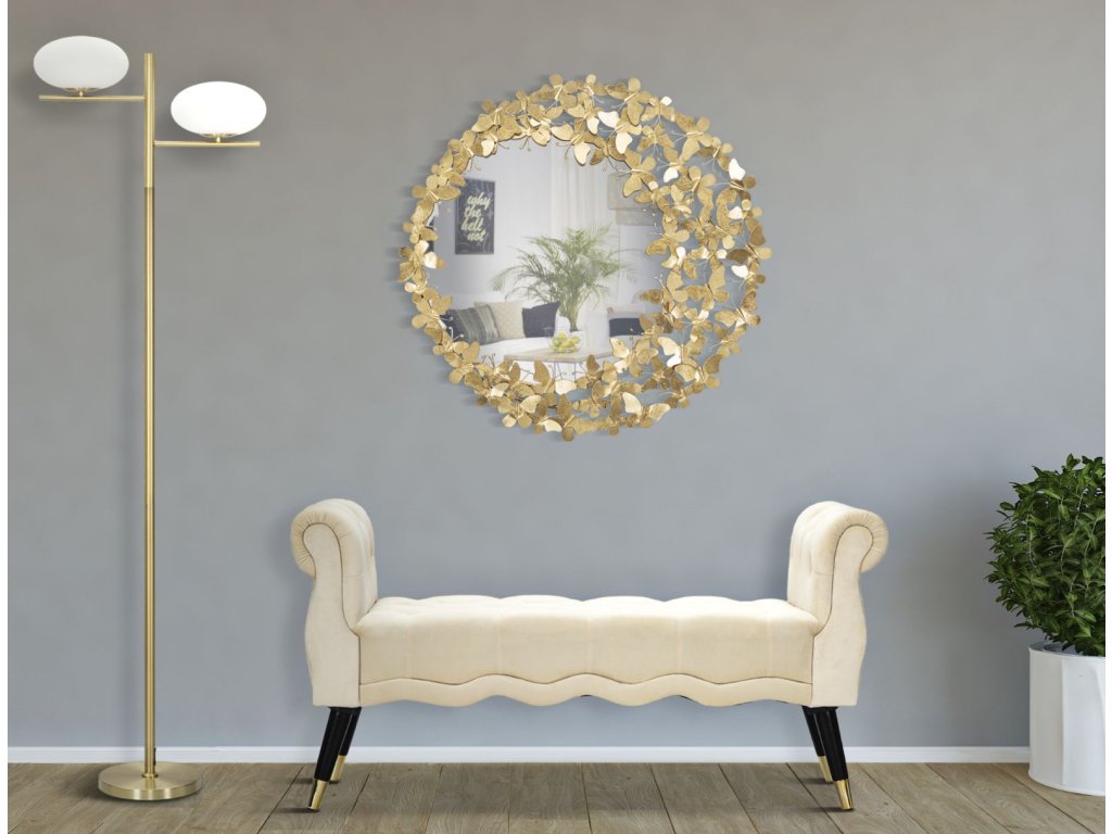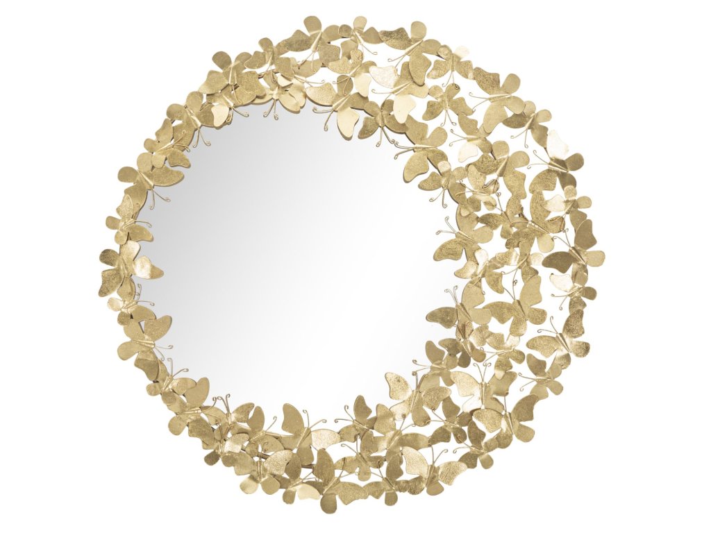 Kulaté nástěnné zrcadlo Butterflies Round má nádherný zlatý kovový rám, který je složen z celé řady drobných motýlků. Zrcadlo dodá vašemu domovu osobní dotek a vizuálně zvětší prostory.