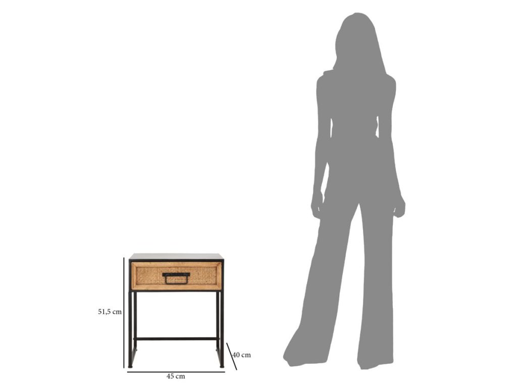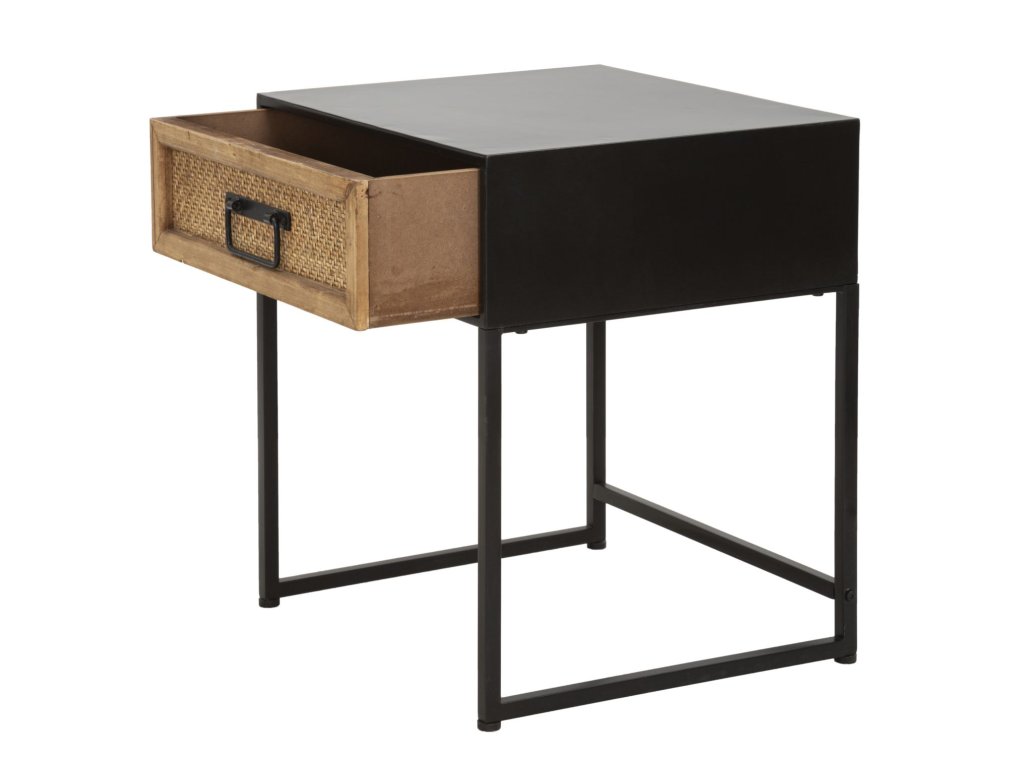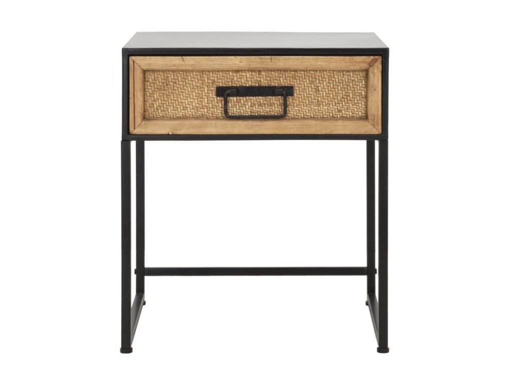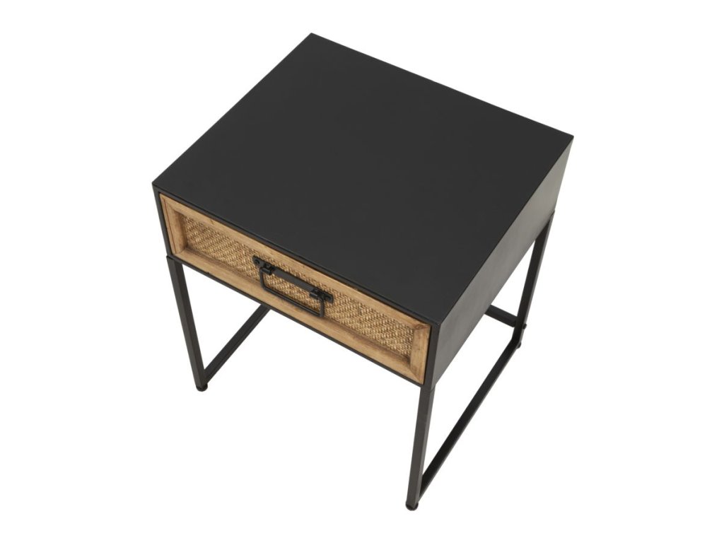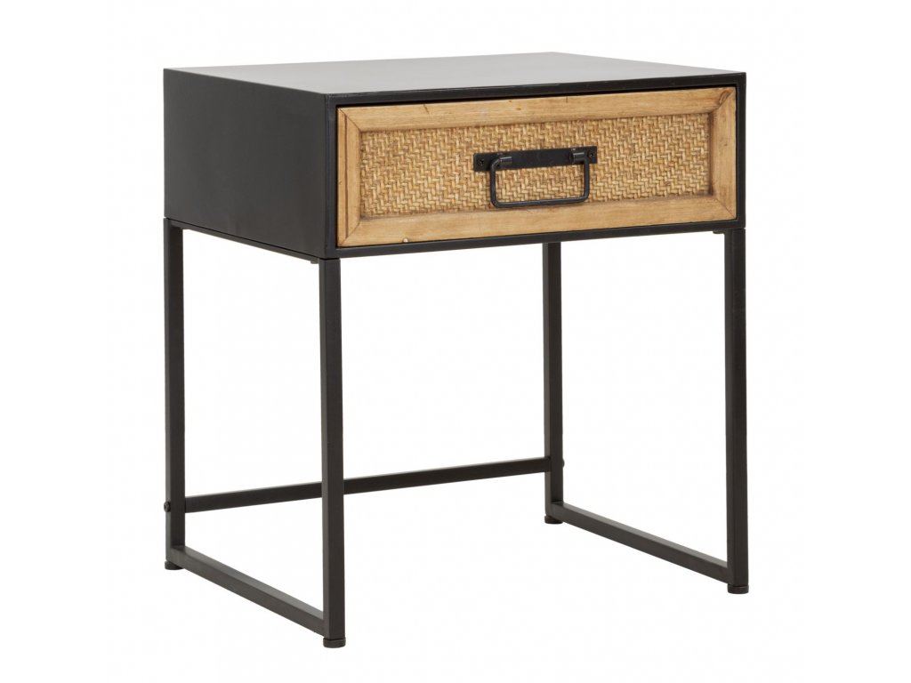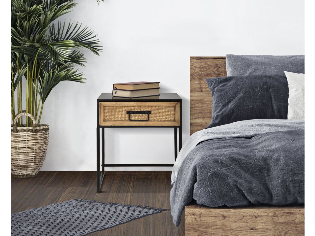 Noční stolek Halmio je vyroben v jemném, industriálním a moderním stylu. Má černou kovovou konstrukci a dřevěnou zásuvku se zpracováním připomínajícím výplet z ratanu. Jednoduchý a lineární design z něj dělá výrobek vhodný ke kombinaci s jakýmkoliv typem nábytku.