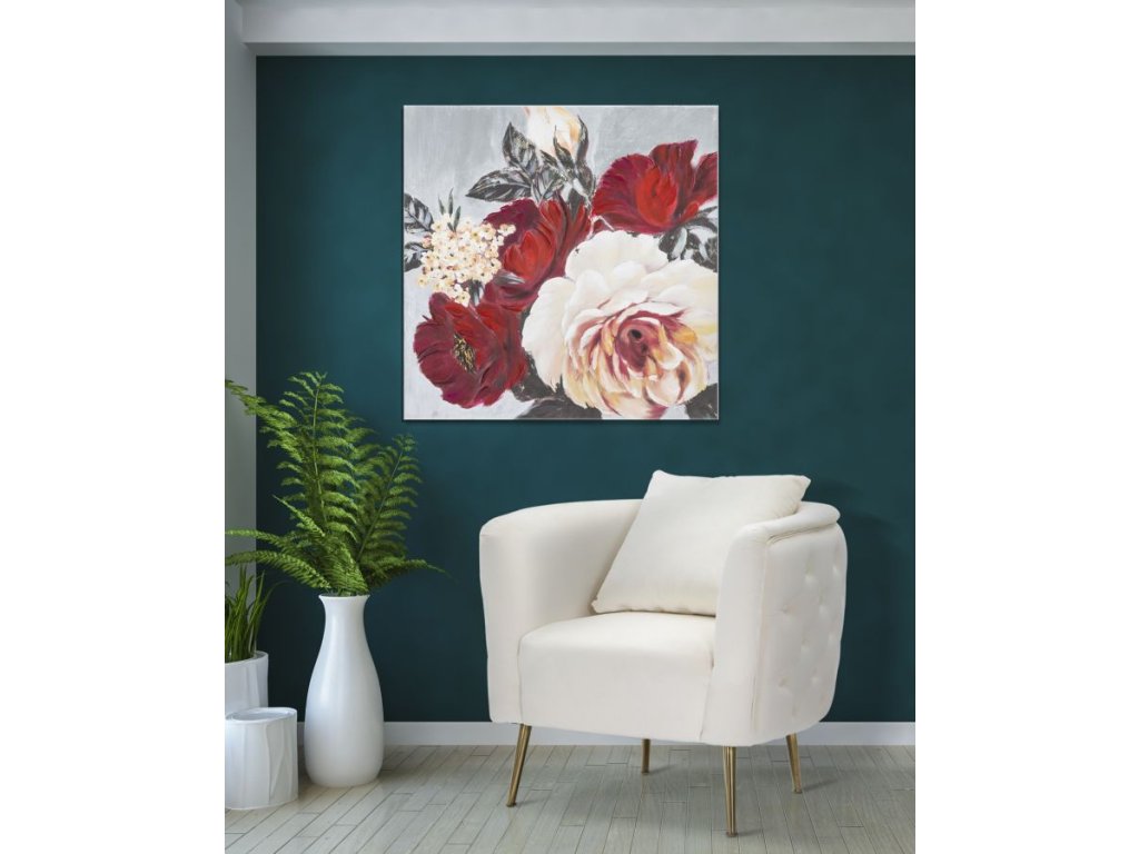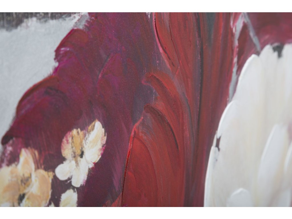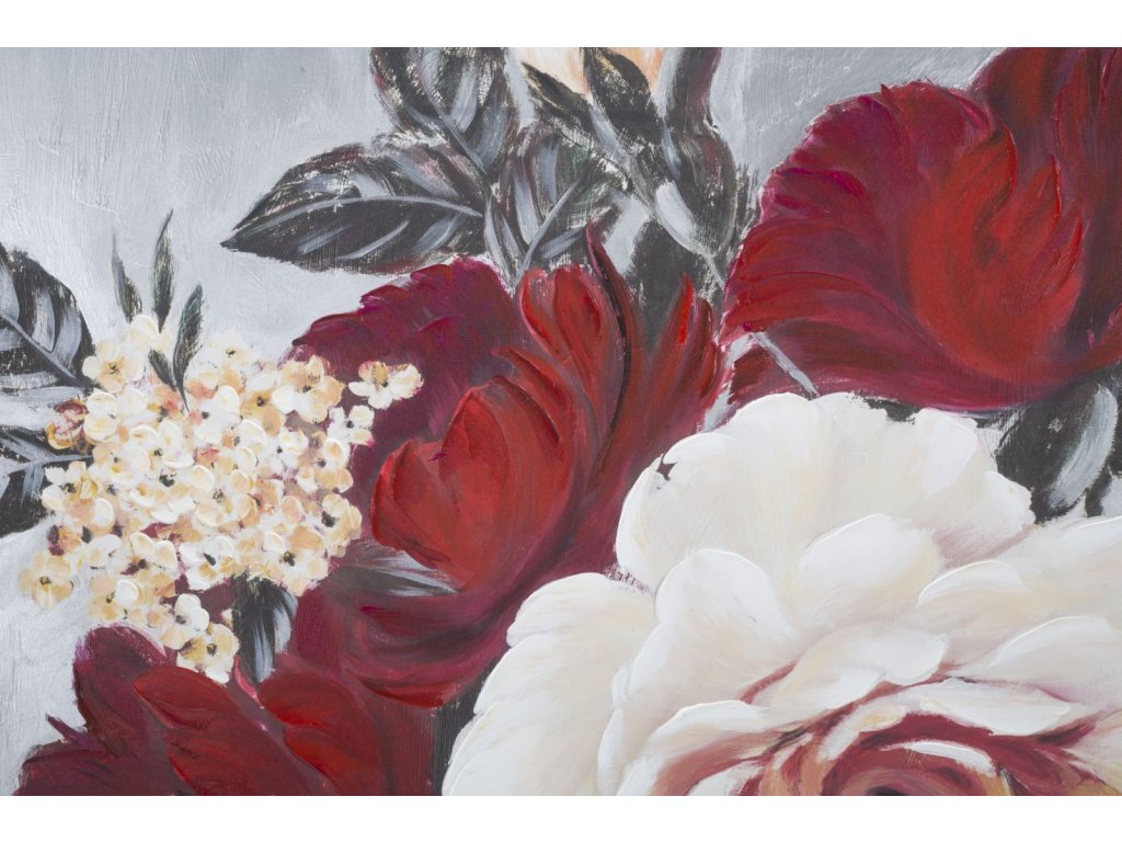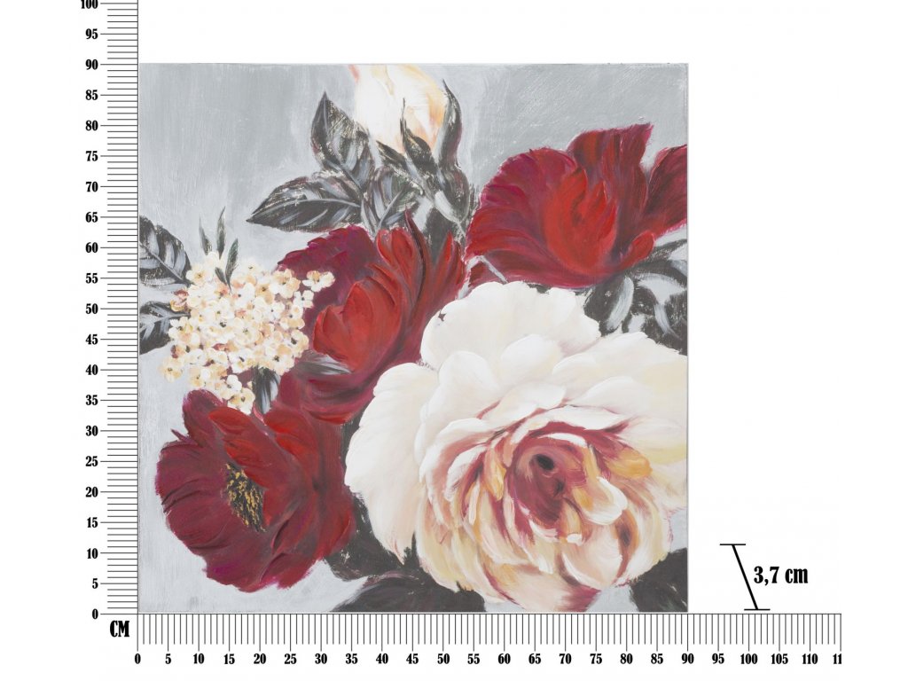 Nádherný, ručně malovaný obraz Stovio zobrazuje několik květů v kytici, přičemž rudé květy obrazu dominují. Je malován na plátně (canvas) s dřevěným rámem z borového dřeva. Do vašeho interéru přinese jemnost a krásu.