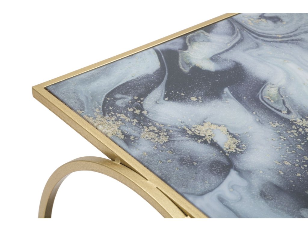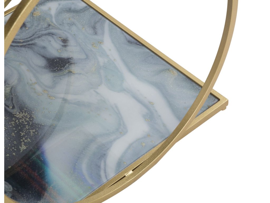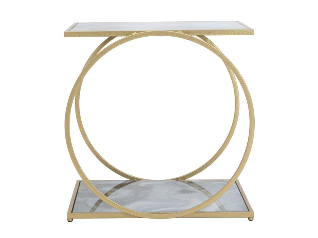 Odkládací stolek Alar O se zlatou kovovou konstrukcí a MDF se vzorem mramoru si zamilujete. Odkládací plochy spojují dva elegantní kruhy. Jednoduchý, ale rozhodný geometrický design dodává každé místnosti nádech zvláštnosti a jedinečnosti.