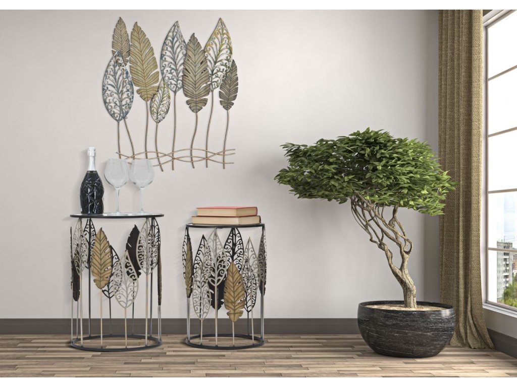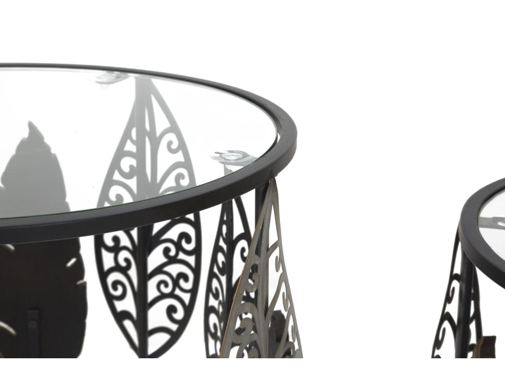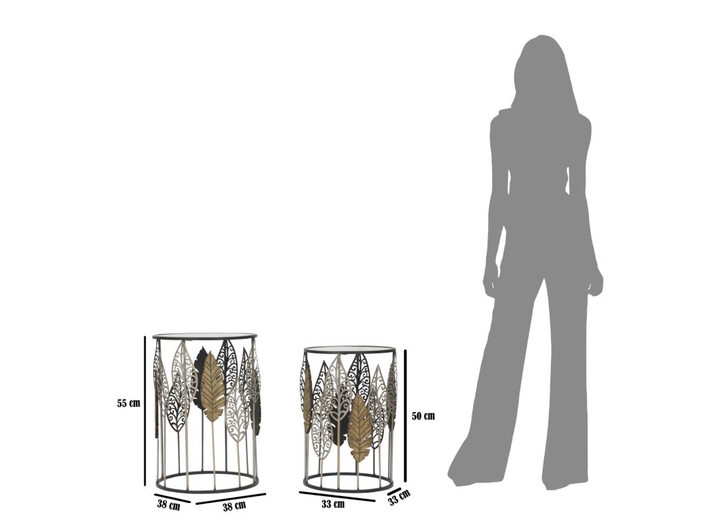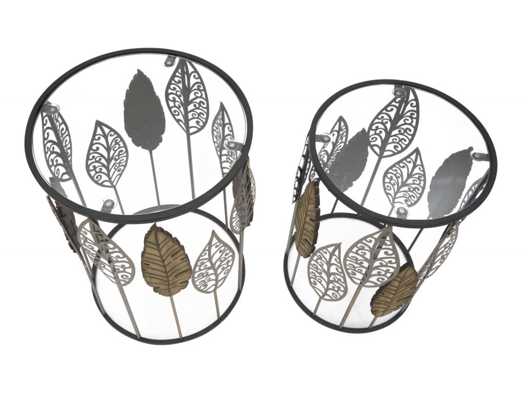 Set 2 kusů kulatých odkládacích stolků Cimios je vyroben z kovu, MDF a skleněné desky a je doplněn o nádherné dekorace ve tvaru listů. Jednoduché linie v kombinaci s vysokou praktičností z něj dělají jedinečný prvek. Nebojte se do svého interiéru vnést trochu hravosti a odlehčení.