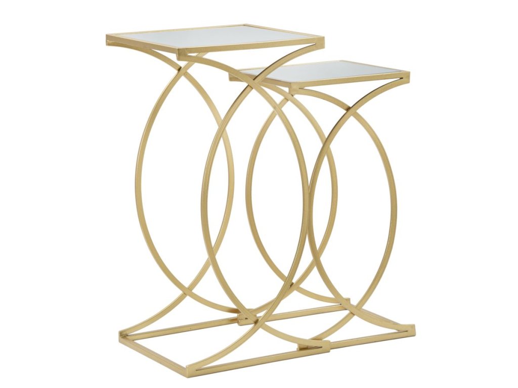 Elegantní pár zlatých kovových konferenčních stolků se zrcadlovou skleněnou deskou s měkkými a klikatými liniemi. Zlatě zbarvený kov dává dotek třídy každé místnosti. Geometrické a zaoblené linie dokonale ladí s jakýmkoli typem nábytku.