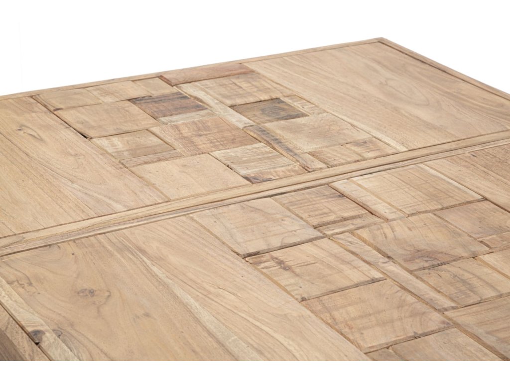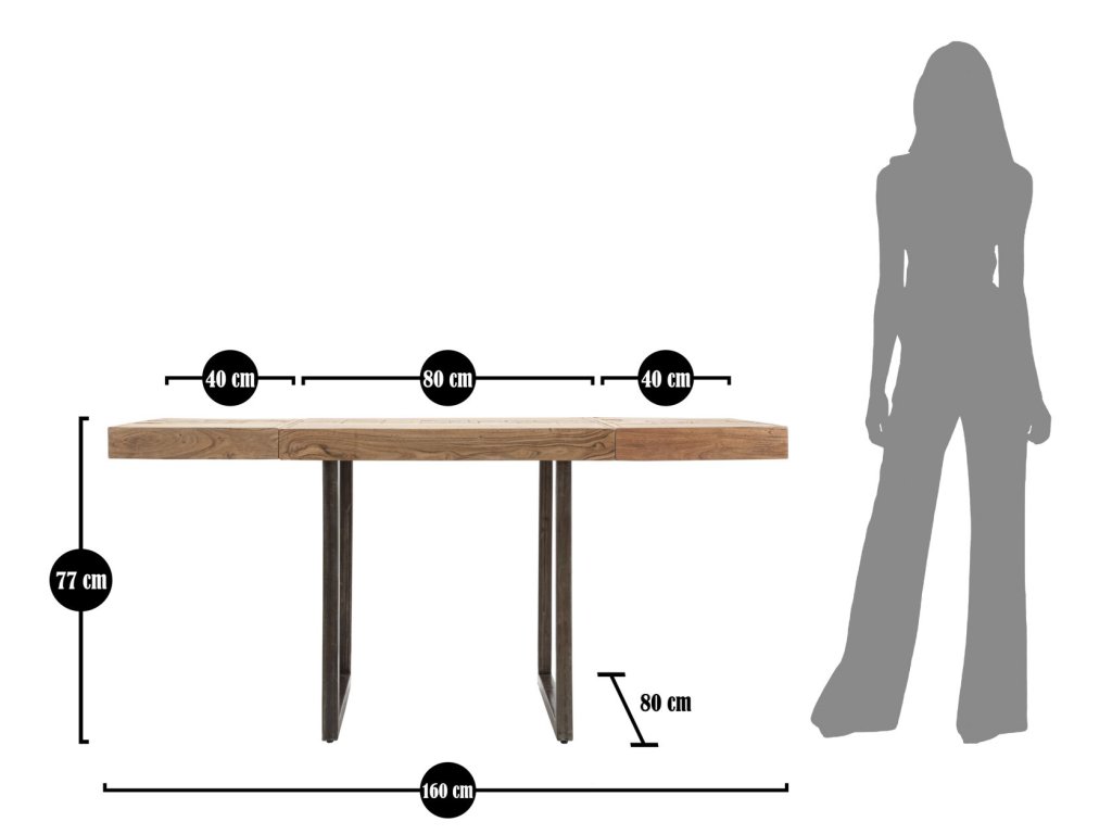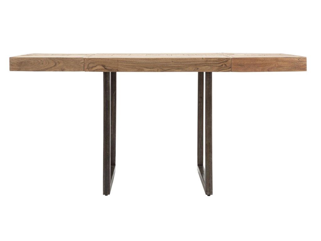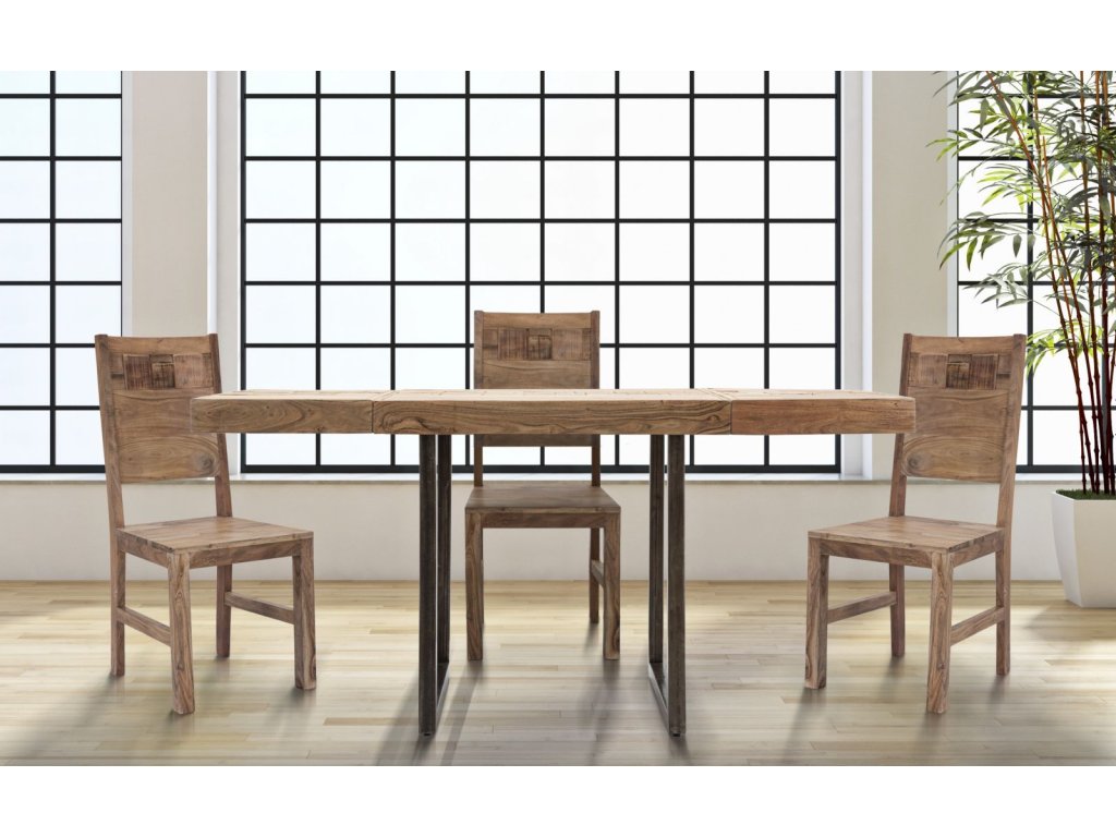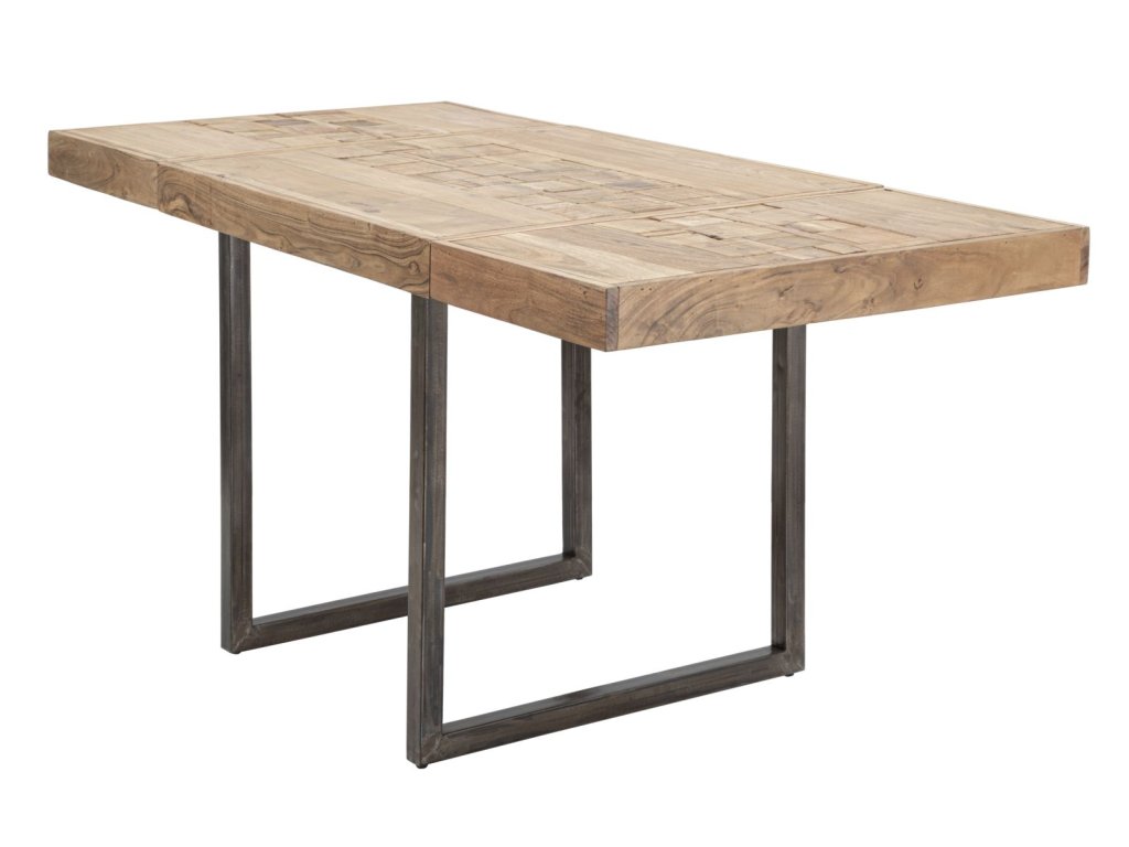 Masivní dřevěný jídelní stůl Nuram je vyroben z akáciového dřeva a kovu. Čtvercový stůl lze rozložit pomocí 2 nástavců na dvojnásobnou délku. Industriální styl v kombinaci se vzácnými intarziemi dodává nádech elegance a rafinovanosti.
