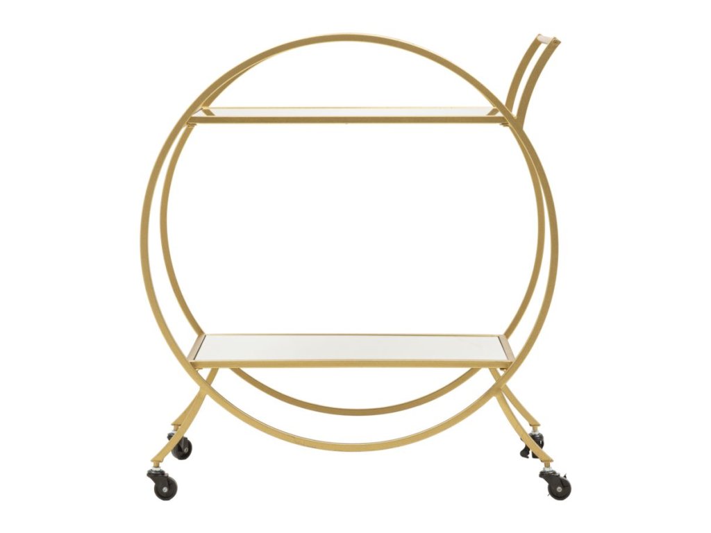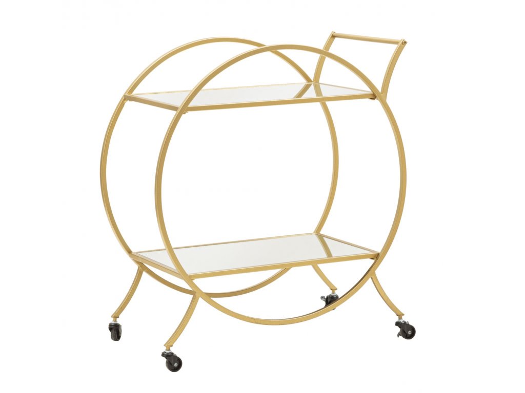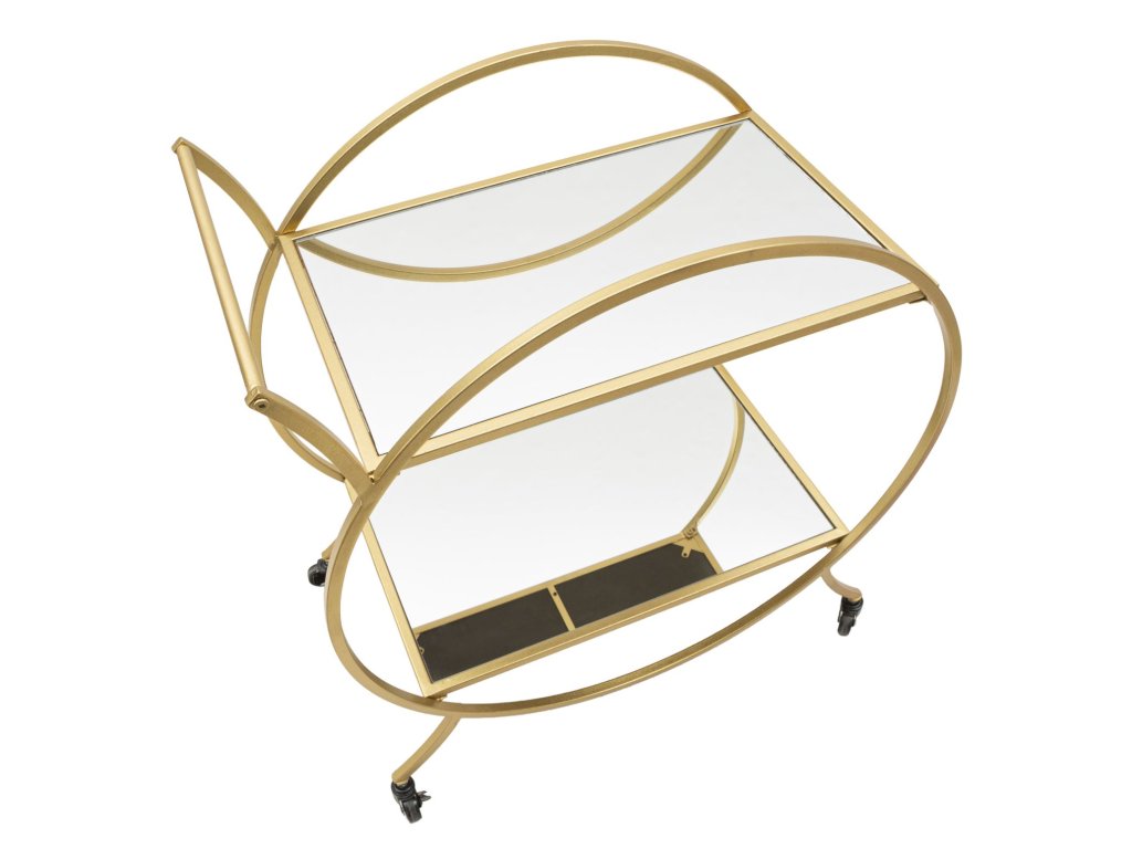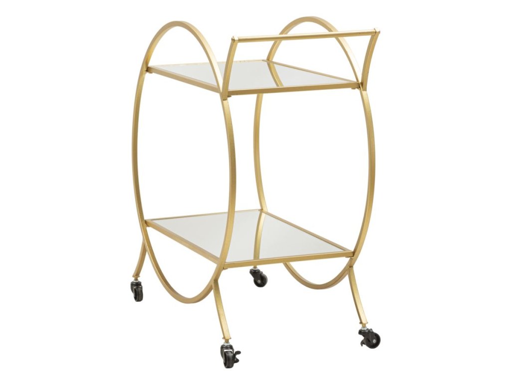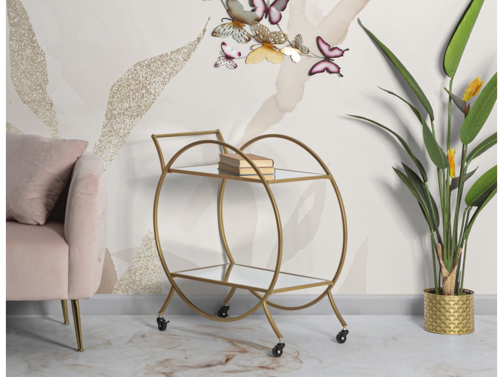 Zlatý kovový servírovací vozík Goda má dvě zrcadlové skleněné police s jednoduchým a lineárním designem. Zaoblené linie mu dodávají měkkost. Kompletní s praktickými kolečky.