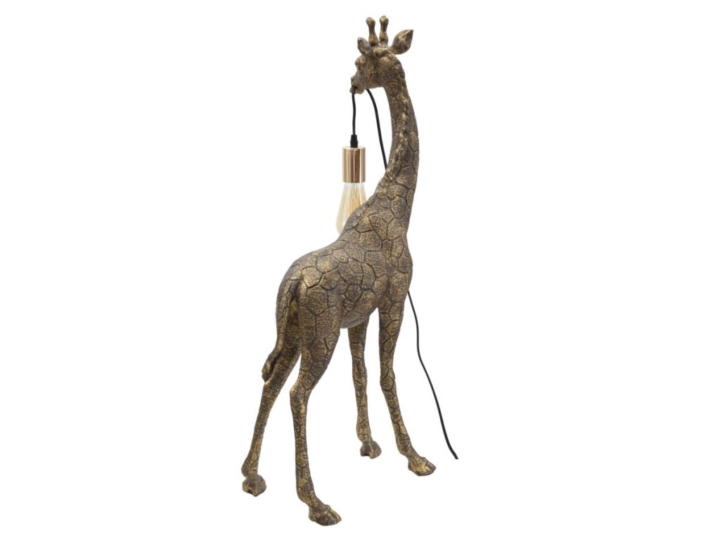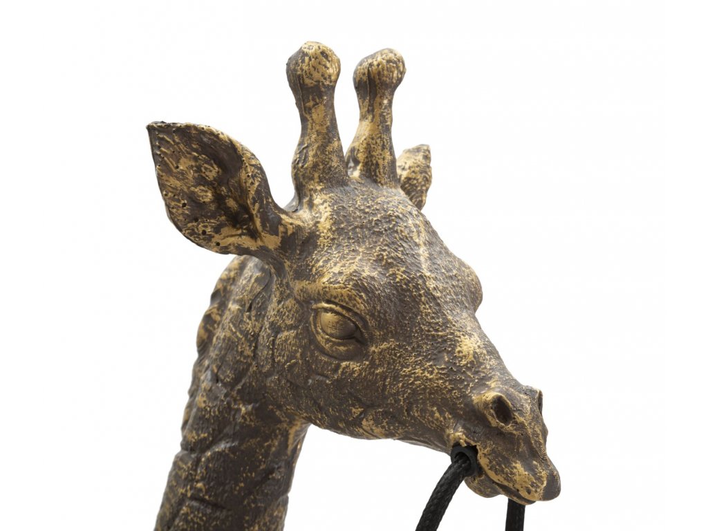 Stolní lampa Giraffe Tall je vyrobena z polyresinu, neboli syntetické pryskyřice starožitné zlaté barvy. Žirafa drží žárovku v tlamě, čímž zajišťuje dostatečnou výšku světelného zdroje. Přinese do interiéru nádech exotiky a relaxace. Lze ji kombinovat s jakýmkoliv typem nábytku.