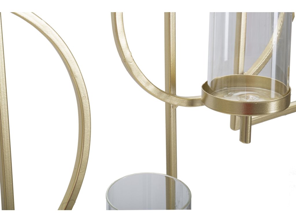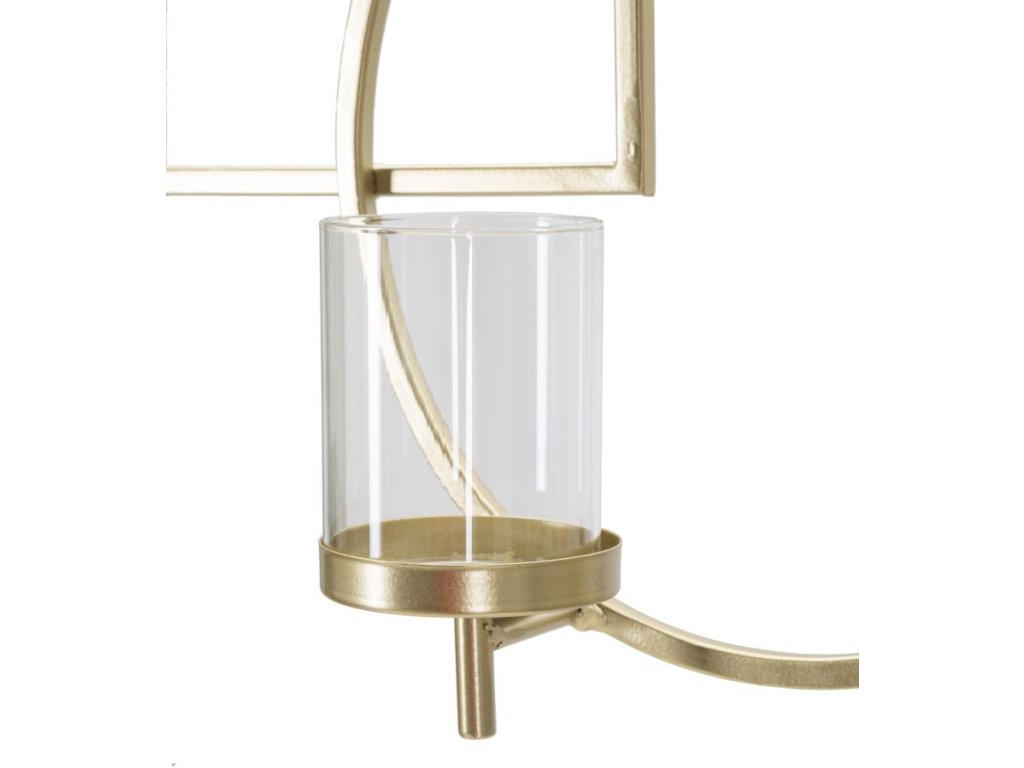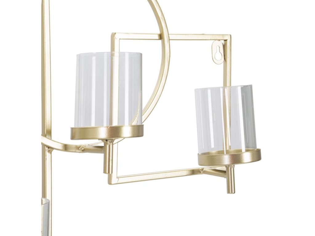 Zlatý nástěnný stojan na svíčky Brila je vyroben z kovu a skla. Má elegantní, minimalistické linie v glam stylu a jako celek je velice vzdušný a decentní. Obsahuje celkem 5 tubusů na svíčky.