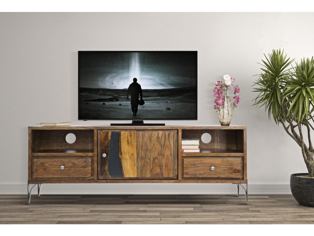 Televizní stolek Taran je vyroben z masivního akáciového dřeva, překližky a kovových nohou. Po stranách má dvě zásuvky a otevřené přihrádky, uprostřed pak jednu velkou skříňku. Zvláštní zpracování s pryskyřicí na zásuvkách ji dodává nádech jedinečnosti a modernosti k jinak elegantnímu a klasickému stylu. Komoda váží 56,9 kg.